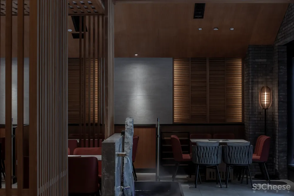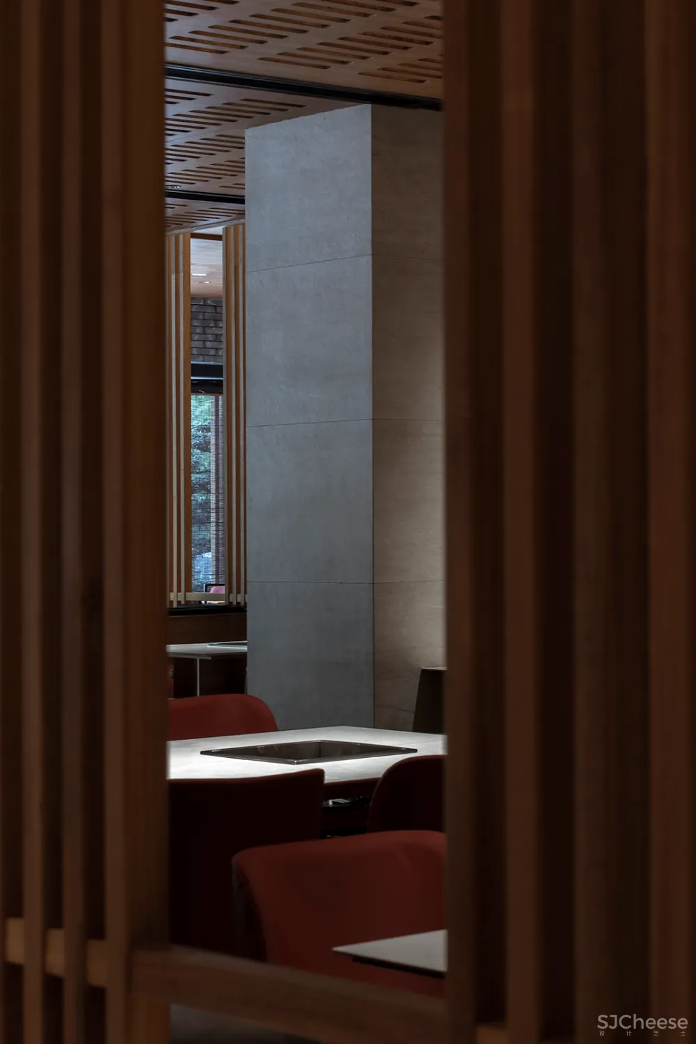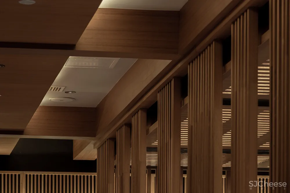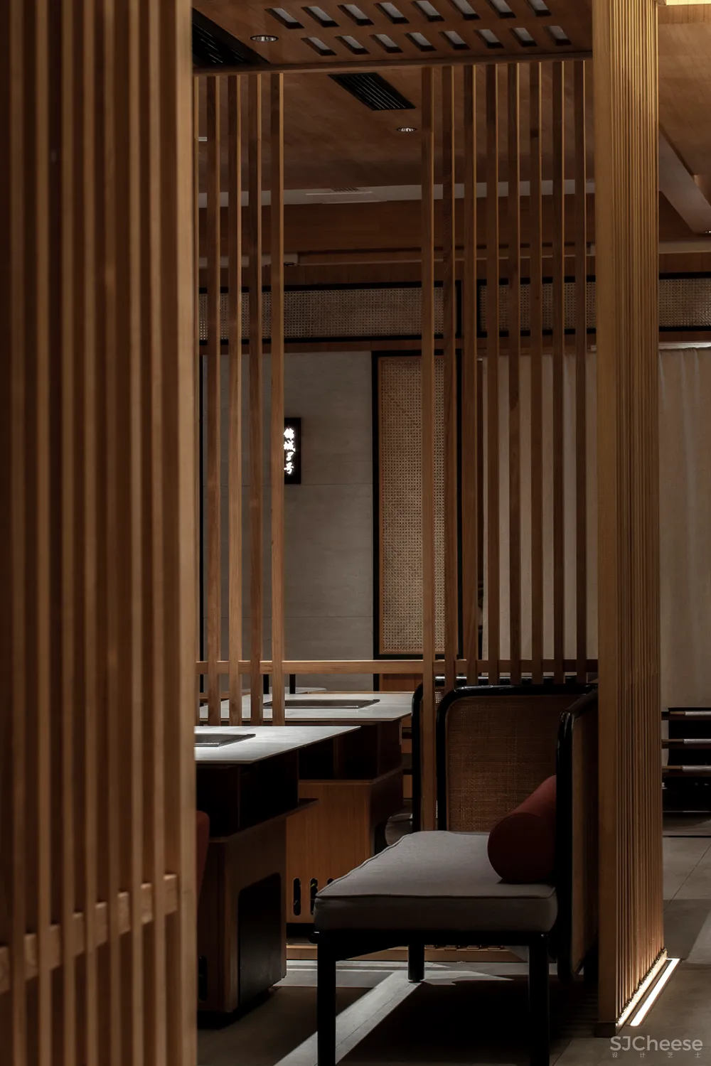 保留特色同时也要满足推陈出新的目的, 融入年轻新潮的氛围。 看似密集的木格栅, 采用了「空间顶面透光」的手法, 打造光与影的意境。 格栅顶部透光方式将光线引入, 漫散的光影, 使空间层次渲染丰富。 火锅热闹的氛围中, 融入光影动势, 使空间更加广阔并带来生机的新鲜感。