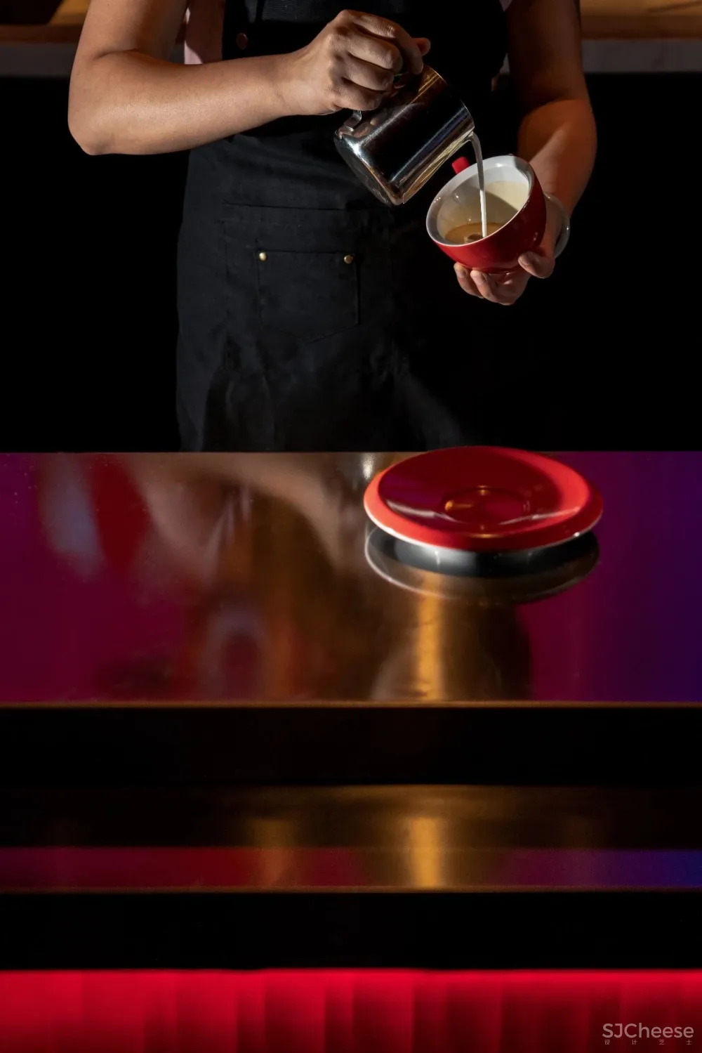 原有吧台及主题背景墙延用了W酒店的红黑色系,因而使整个业态完全隐藏在了公共区域的色彩配置中,继而无法彰显「ZHAO COFFEE BAR」本身的定位与品牌特色。