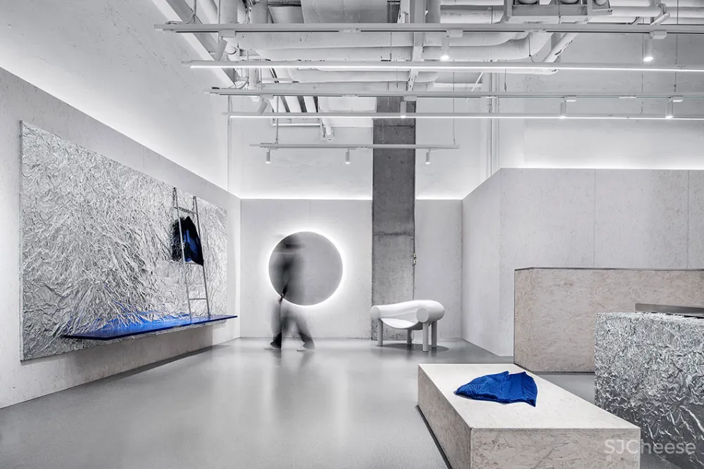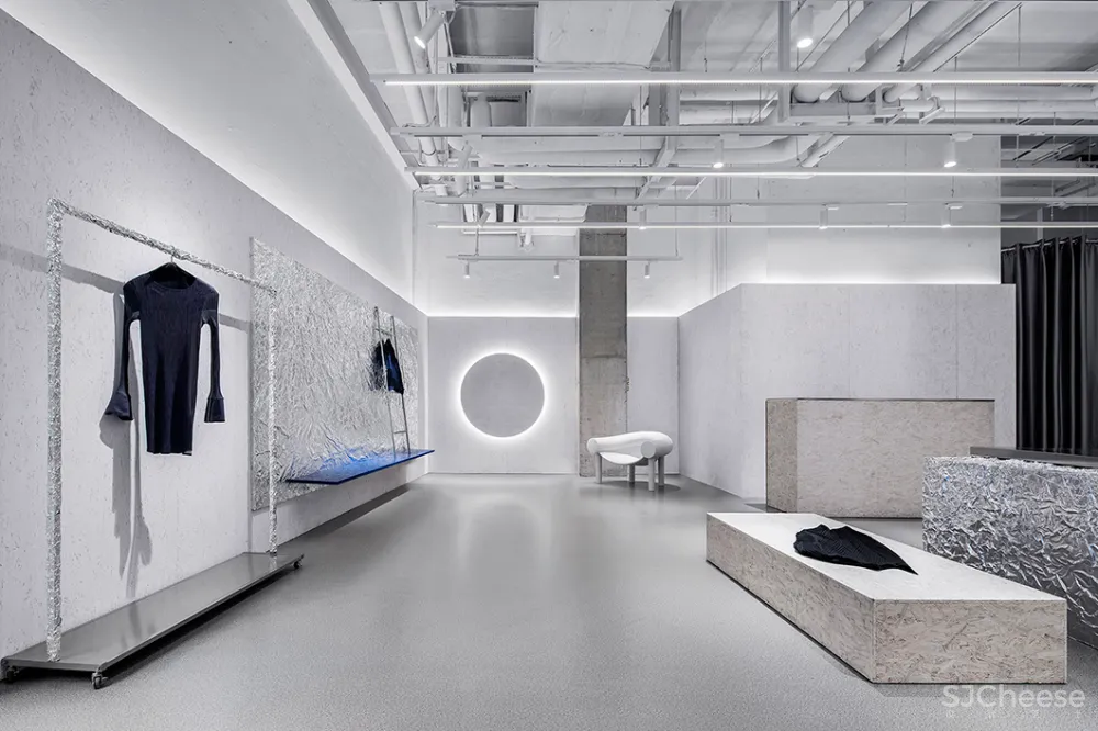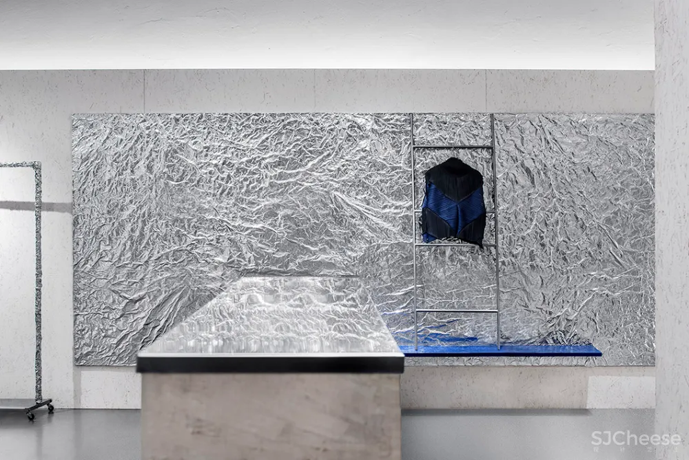 锡纸被揉皱后又铺展开,人为制造出随机的肌理和材质本身的金属质感回应了服装面料的工艺和光泽感,又与哑光的乳白色刨花板产生对比。这些材料加强了人们对于品牌核心面料的感受,成为品牌印象的一部分。