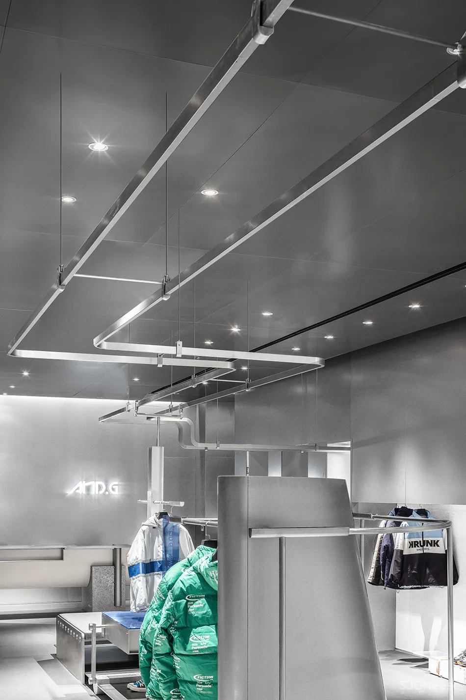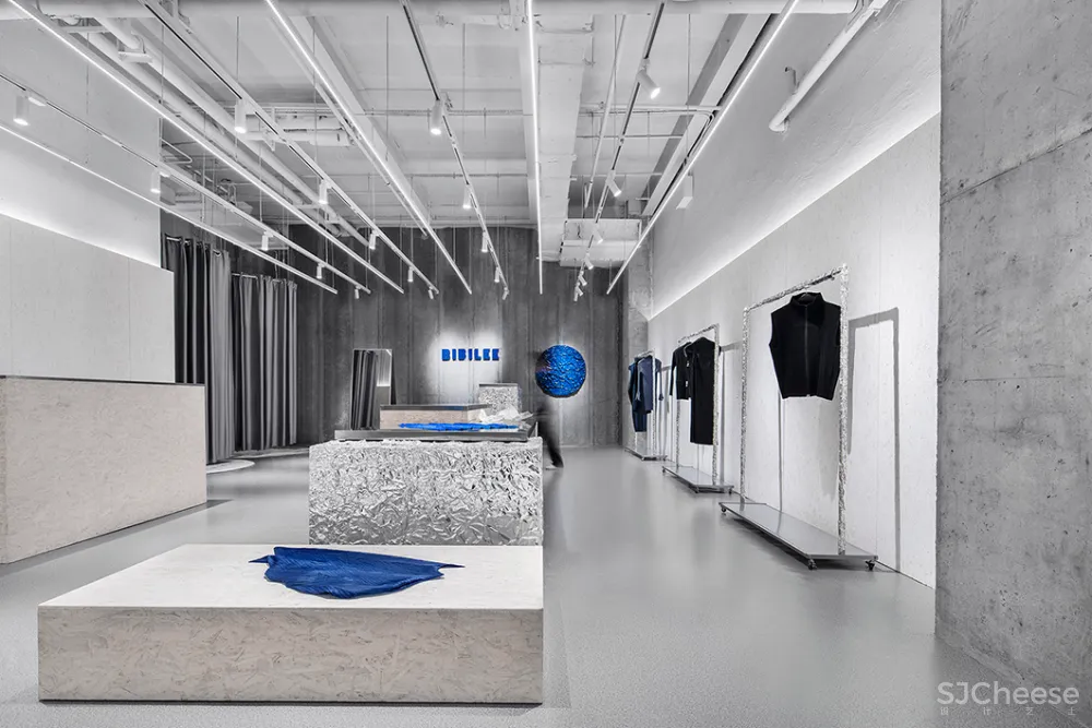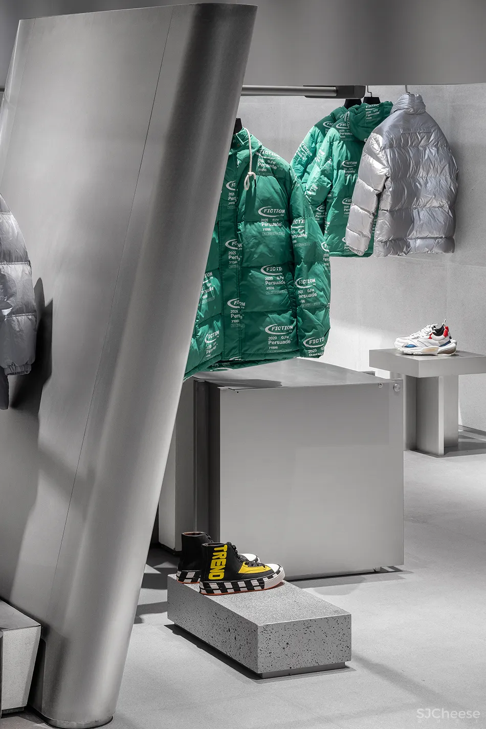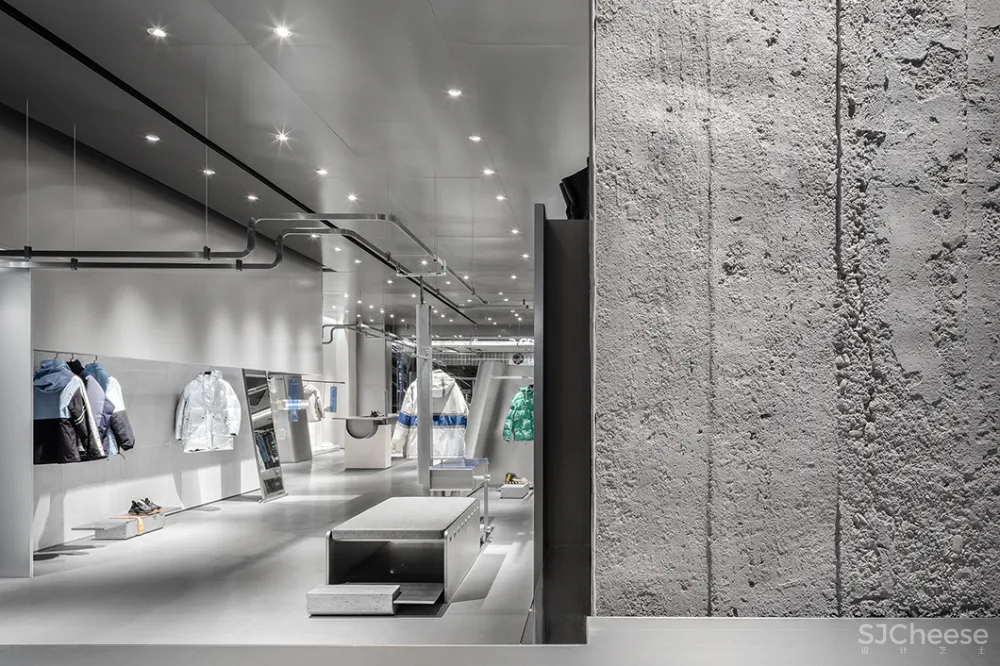 结合场地条件与工期要求,设计师抛弃传统服装商业空间对展陈设计的过度追求,保留了混凝土柱和部分混凝土墙壁原有的材质肌理,天花仅仅做了喷白处理。