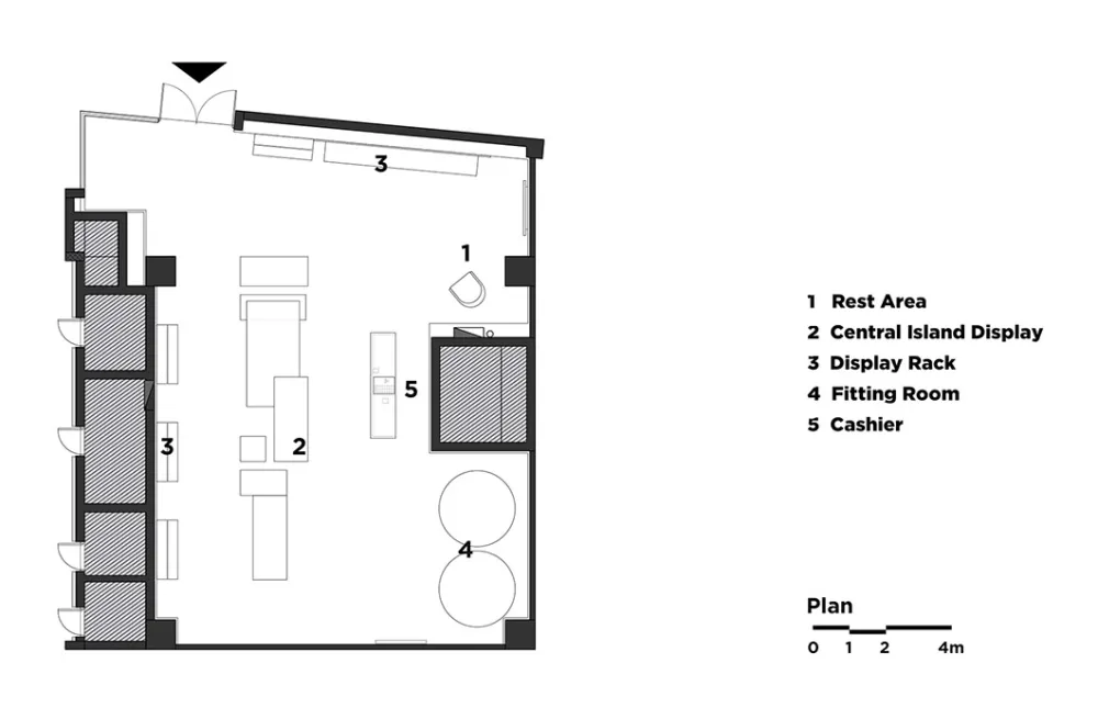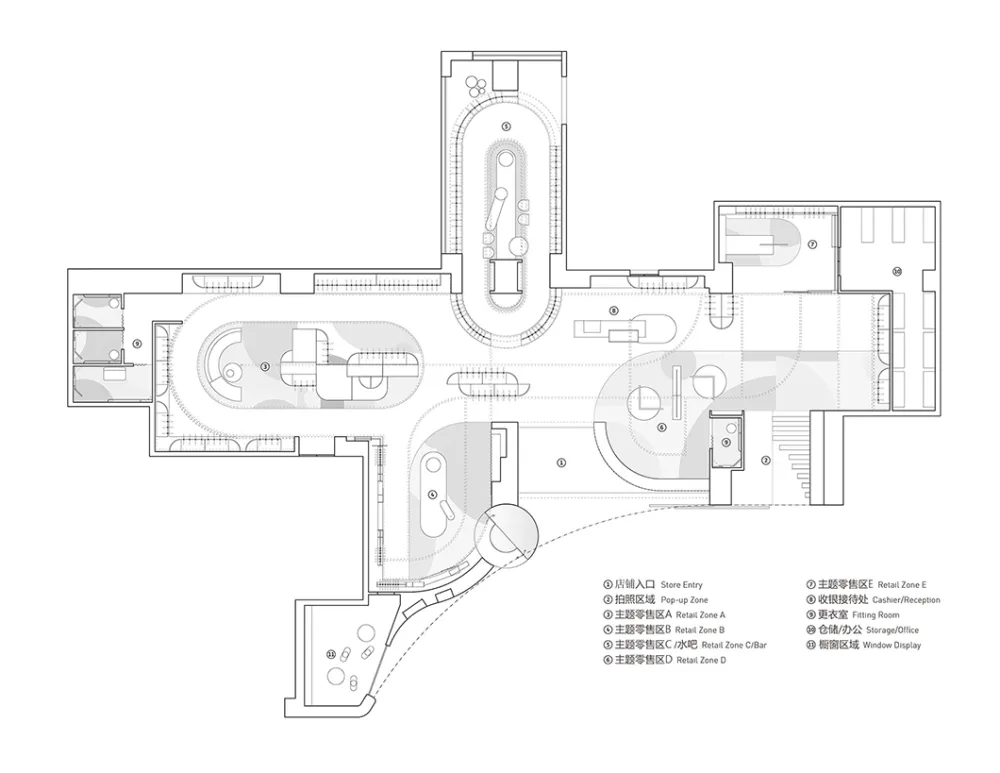 内部空间的设计则打破了一般零售空间相对统一的手法,结合场地特点将空间自然划分为不同特性的区域。