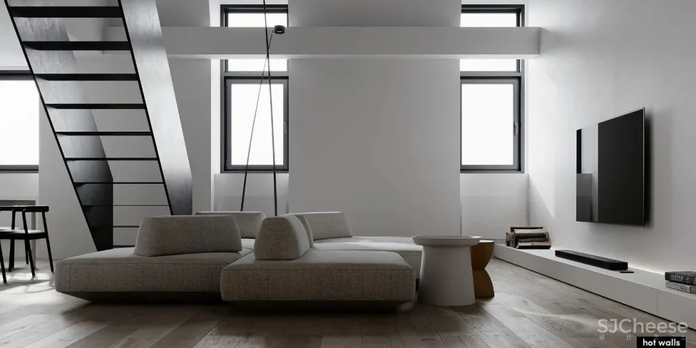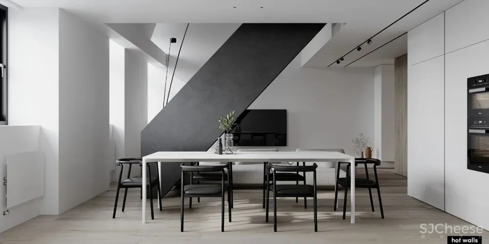 黑,白,灰,是整个客厅的材质用色,比较内敛,沉静。沉稳温丽的色调下,线条利落有致,格局清晰,结构性强,空间质感不言而喻。