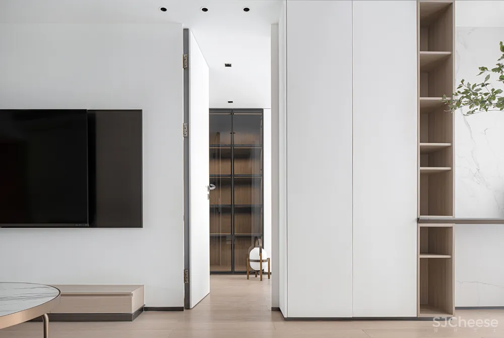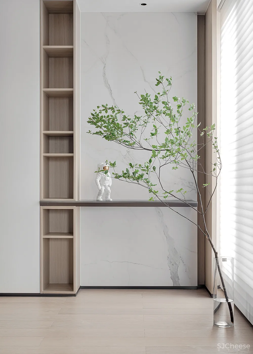 玄关结合收纳柜和陈列柜做一体化设计,摈弃浮华的线条和装饰,极简白的岩板背景墙与手工漆柜面,搭配清爽自然的木饰面,简洁实用又美观,让人一进门就感受到一股优雅的气息。