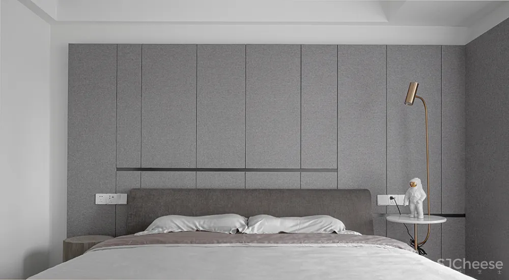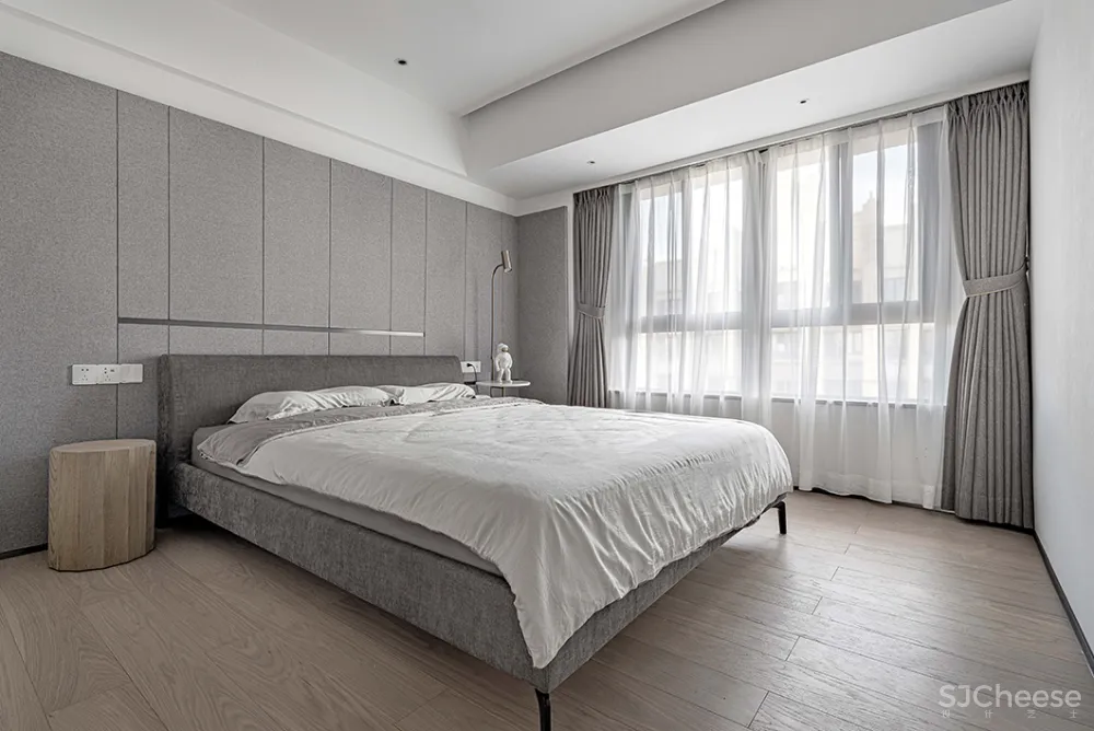 主卧延续了整体空间的简约质感,运用沉静简美、简洁有力的设计语言创造出一个独具厚度的舒适空间,体现出居住者的审美情趣和文化品位。