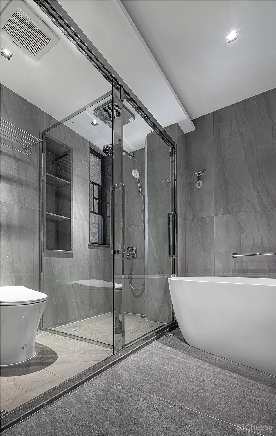 卫生间的墙面与地面瓷砖,个性的纹理搭配中性的色调,通过唯美的规划分割,实现功能与美感的结合。