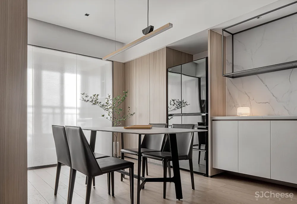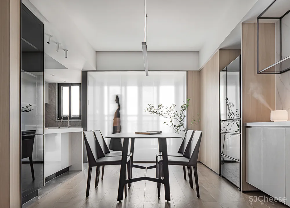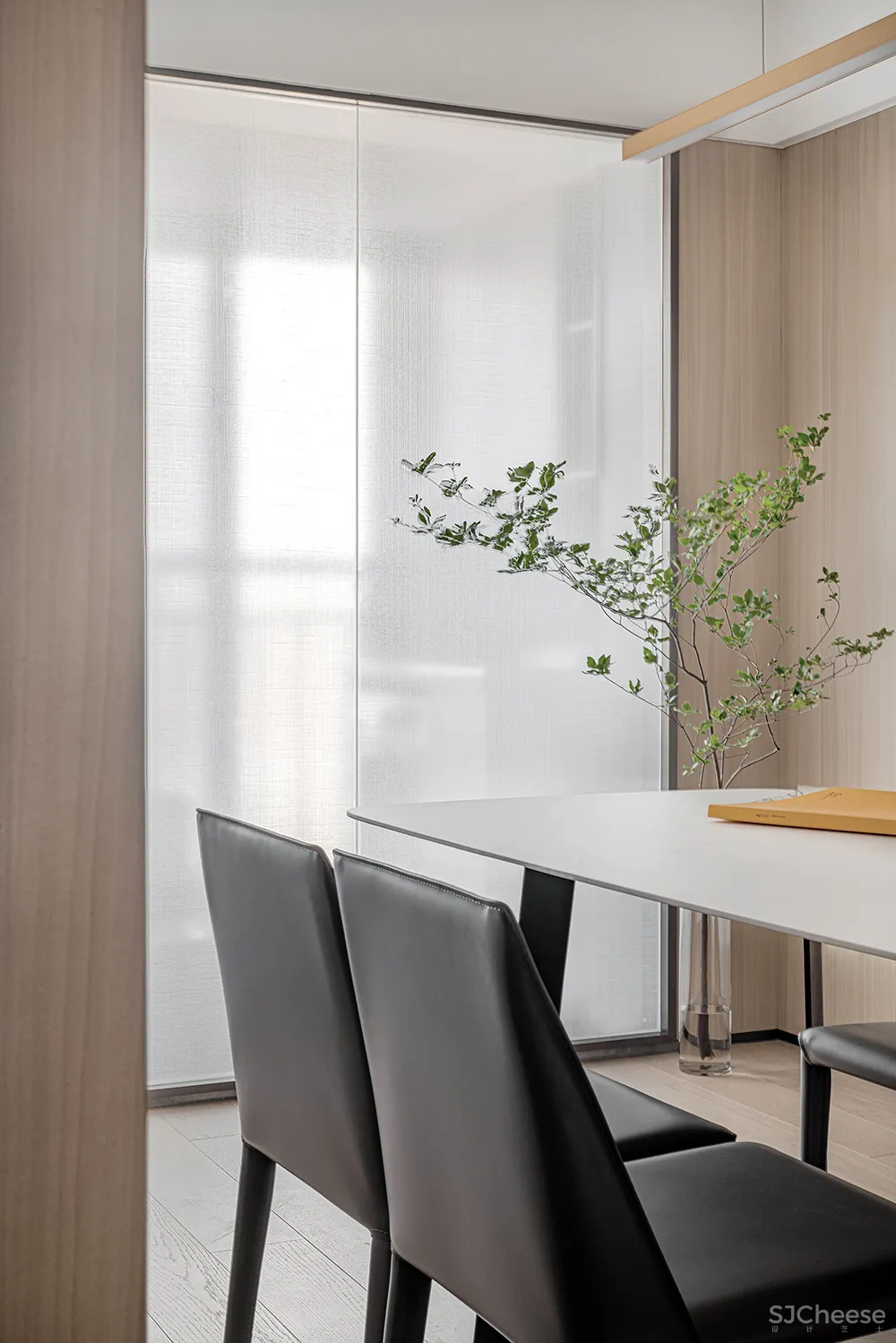餐厅和生活阳台之间用通透细腻质感的夹丝玻璃做隔断,既延伸了空间视觉,又最大化地将光线保留到室内,使空间更加宽敞明亮、舒张通透。