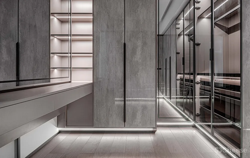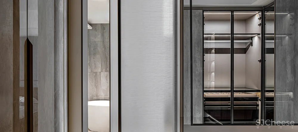 高级定制衣帽间采用夹丝玻璃隐藏式移门,保留了私密性,又增加空间的通透性,让开放性和私密性共存 。