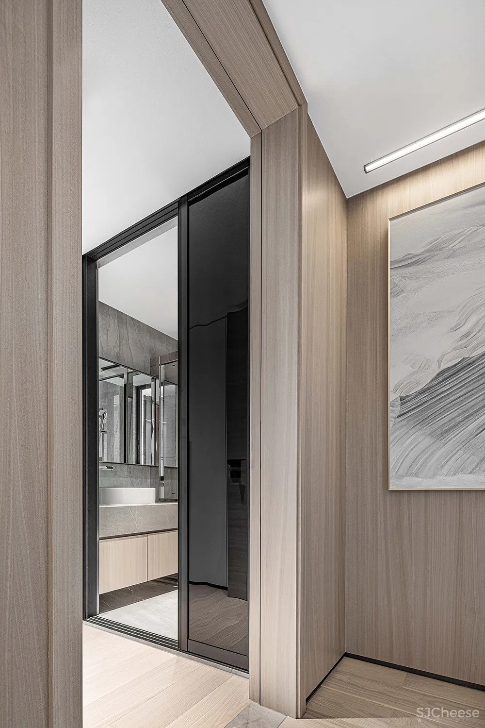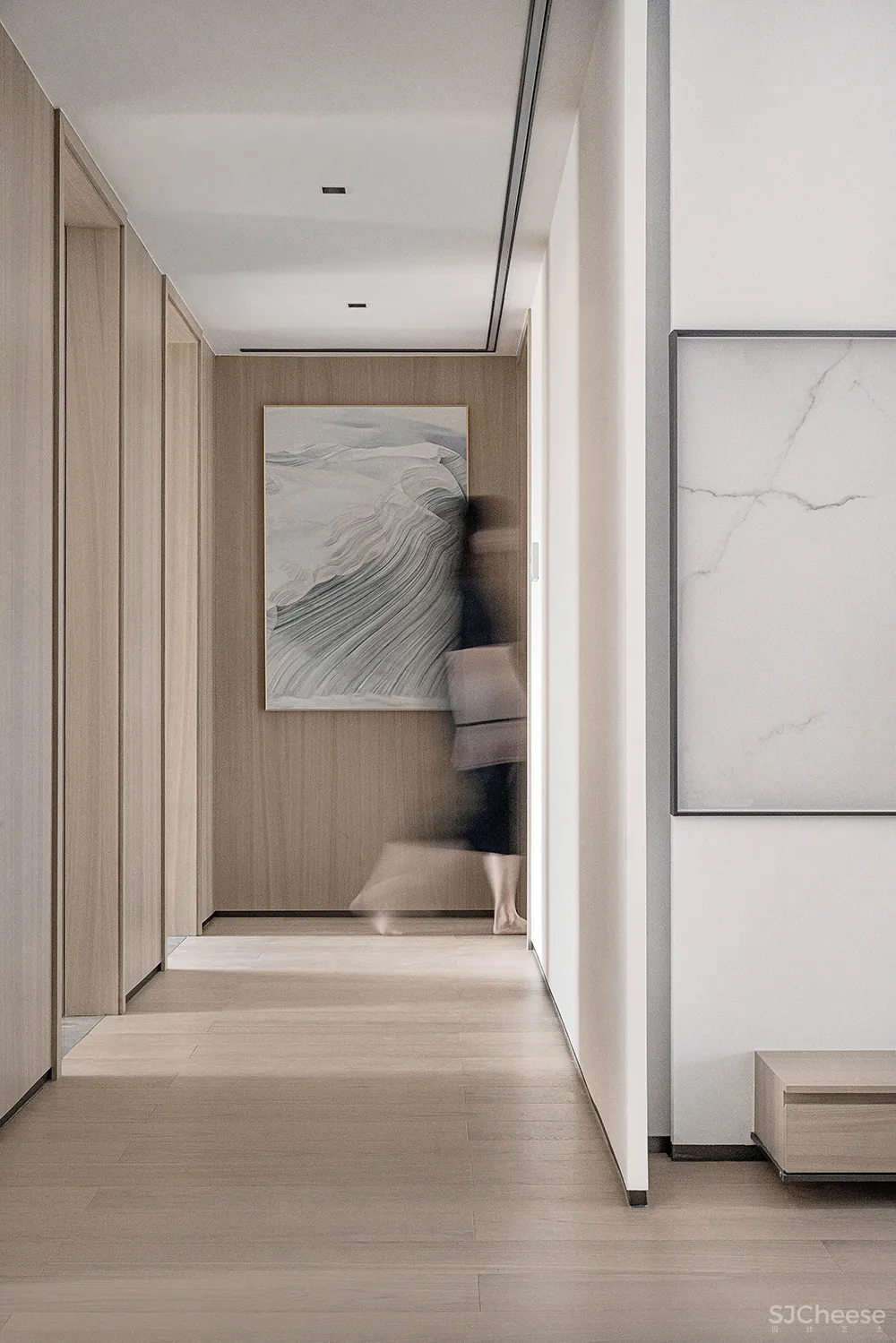 过道延续了整体空间的色调,素白的手工漆墙面,温和的原木色木饰面,素雅的定制挂画,与整体氛围搭配十分和谐,流露艺术的简雅之美。