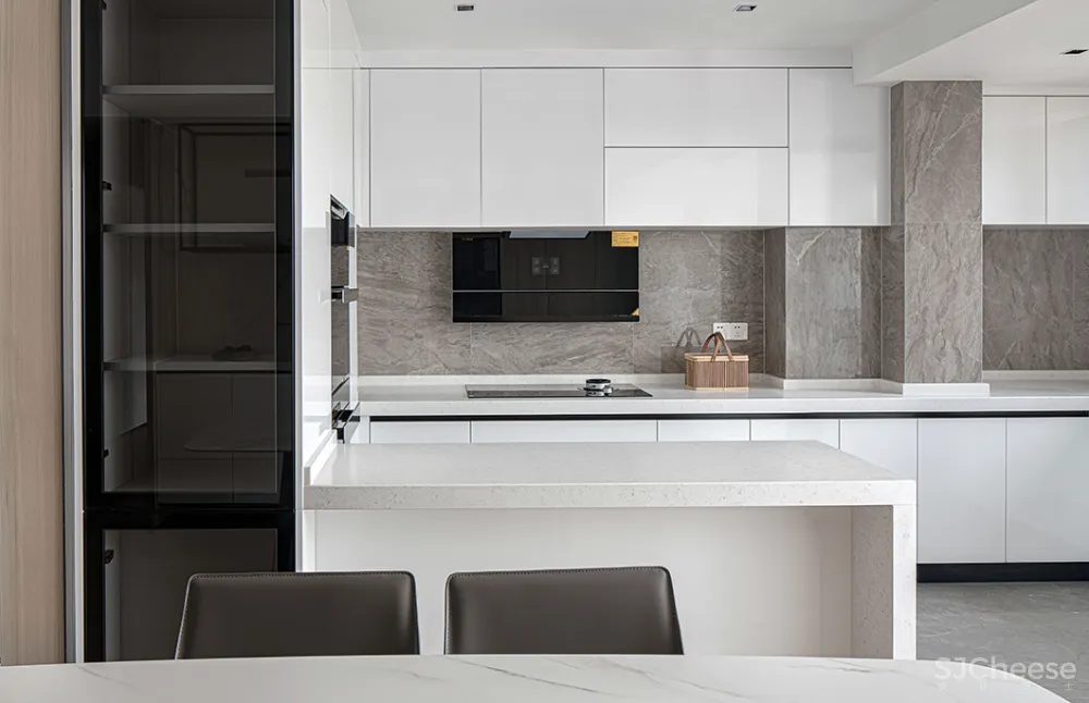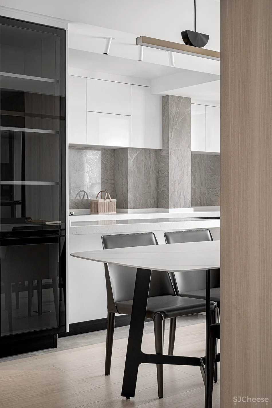 厨房打破了常规的厨房格局,将厨房、吧台与就餐区融为一体,采用低调简约的黑白灰色调,正好将空间里一切有颜色的东西对比出来,被动式的美观,更直接地冲击着我们的视觉神经和味觉神经,从而体现了一种精致生活。
