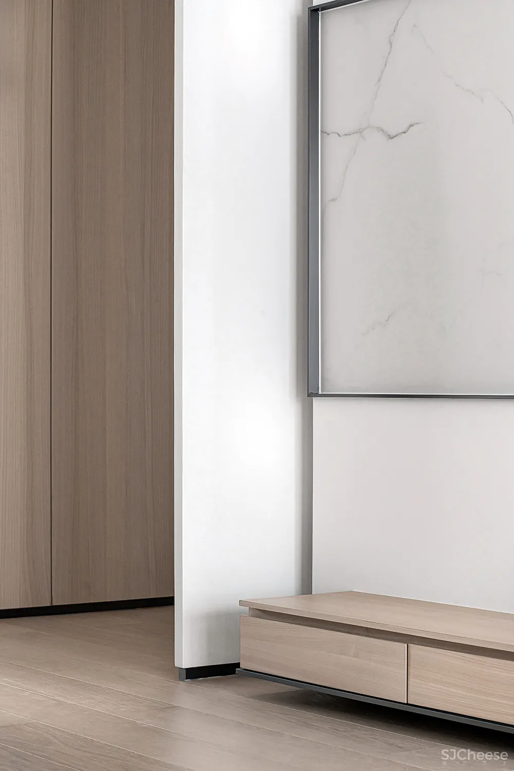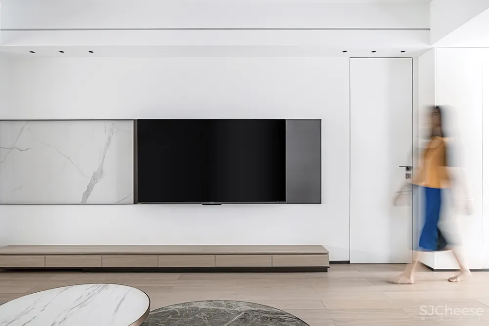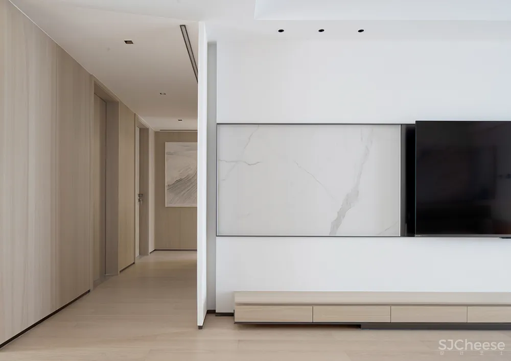 搭配原木色电视柜,不同材质的细腻纹理相互融合,充满纯净想像,使空间飘散着细腻与暖度。