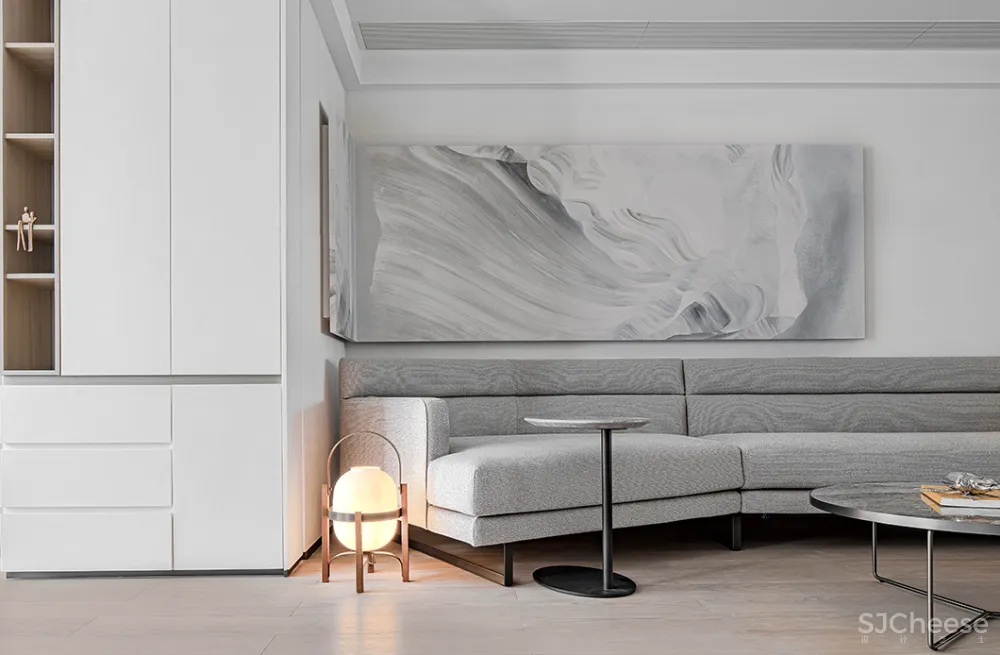 沙发背景设计了不对称L型定制墙画,营造舒适又充满灵感的生活空间,满足了空间环境的感性需求。