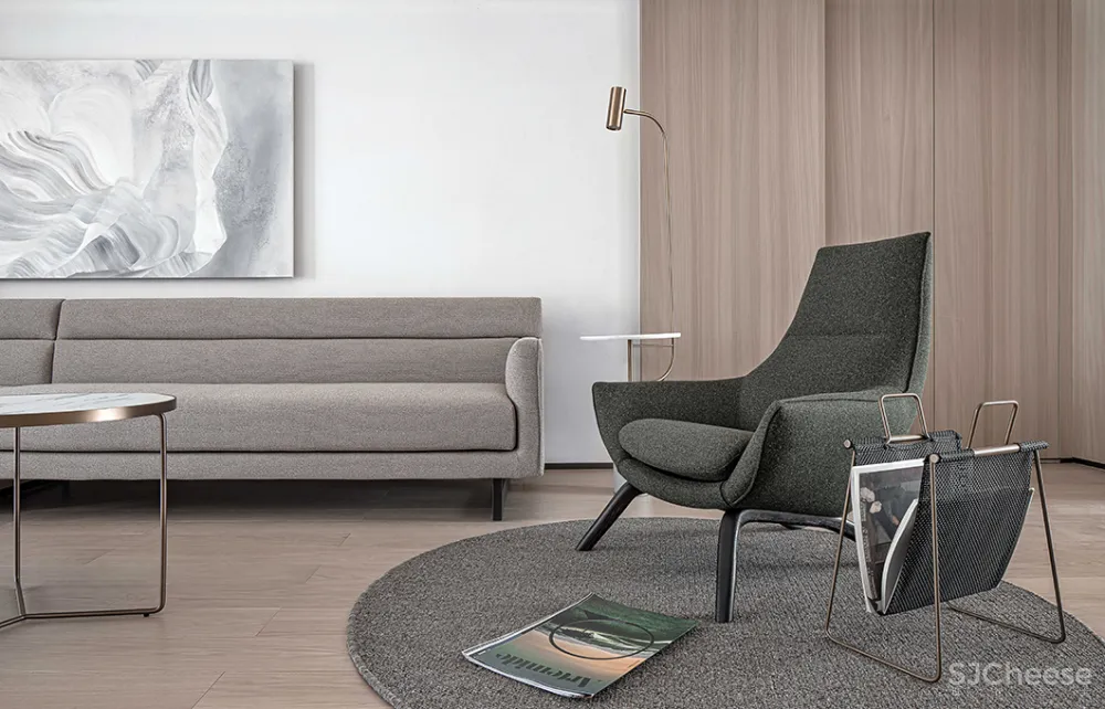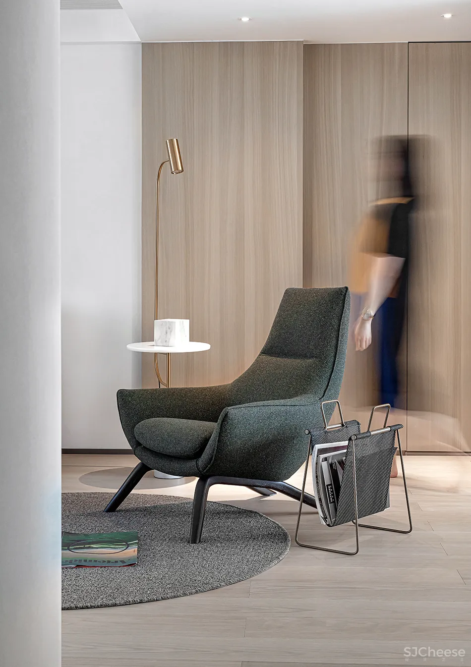 客厅没有添置繁琐的软装,灰色的异型转角沙发搭配暗绿色的休闲椅,加上大理石多功能茶几落地灯光的渲染,为空间增添了一丝暖意,满足了业主优雅的品味和生活方式。