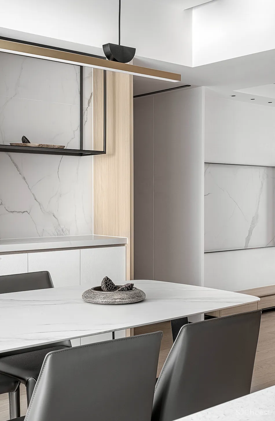 餐厅沿用温润的原木色调,温柔的配色让温暖与高雅并存,营造了自然舒适、温馨恬静的用餐空间。