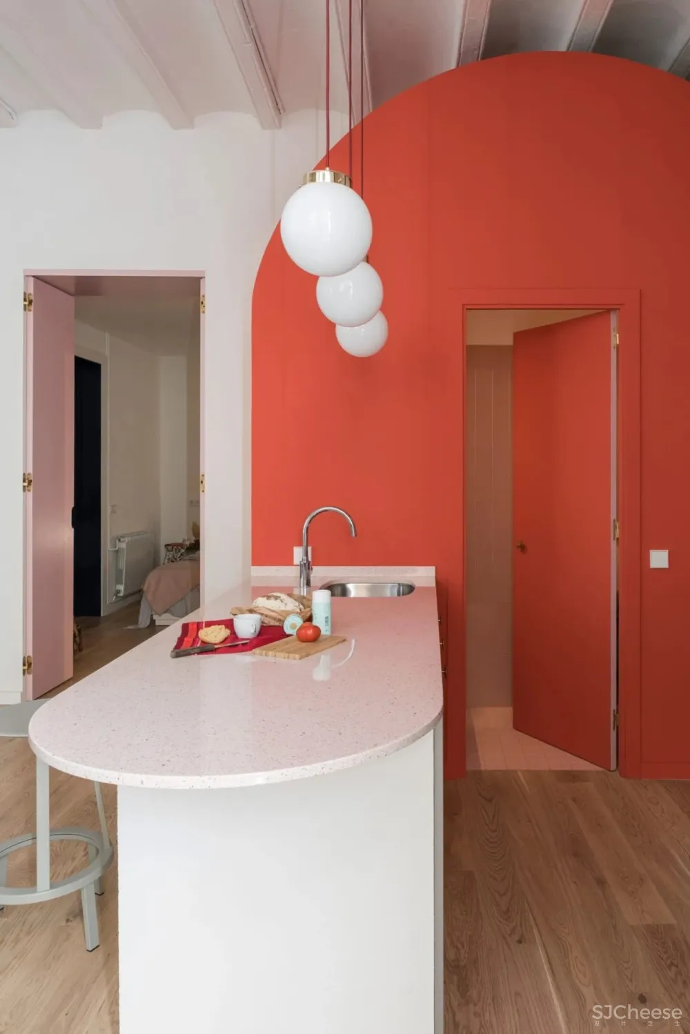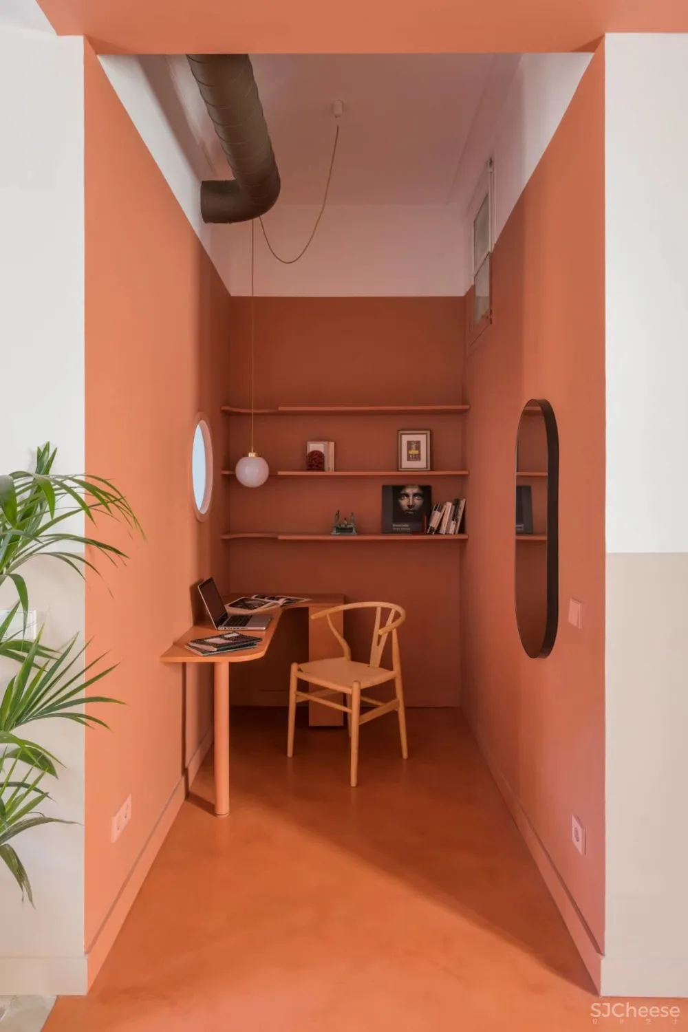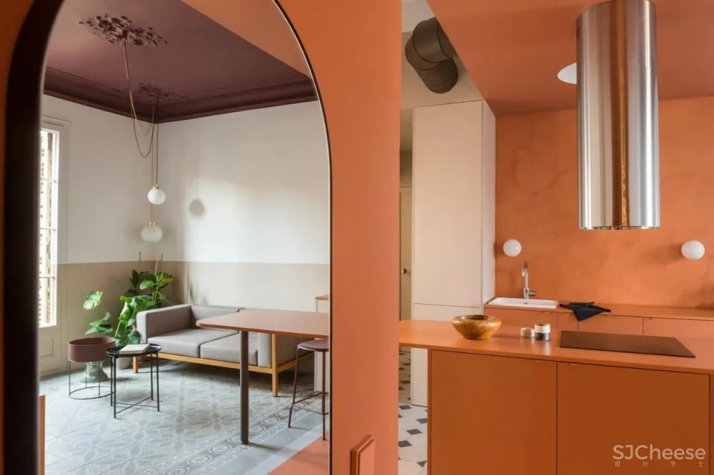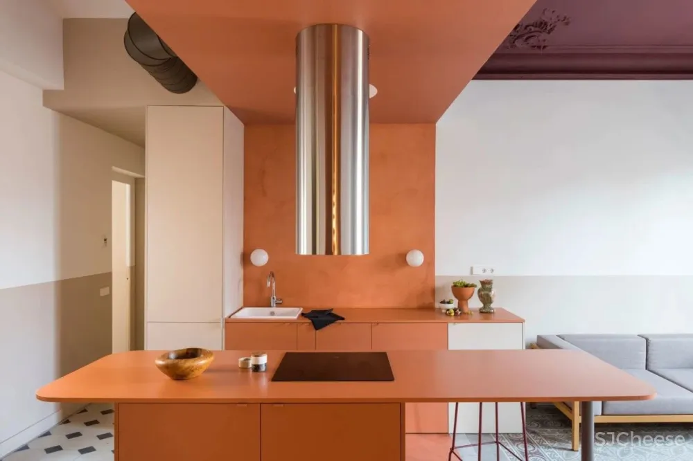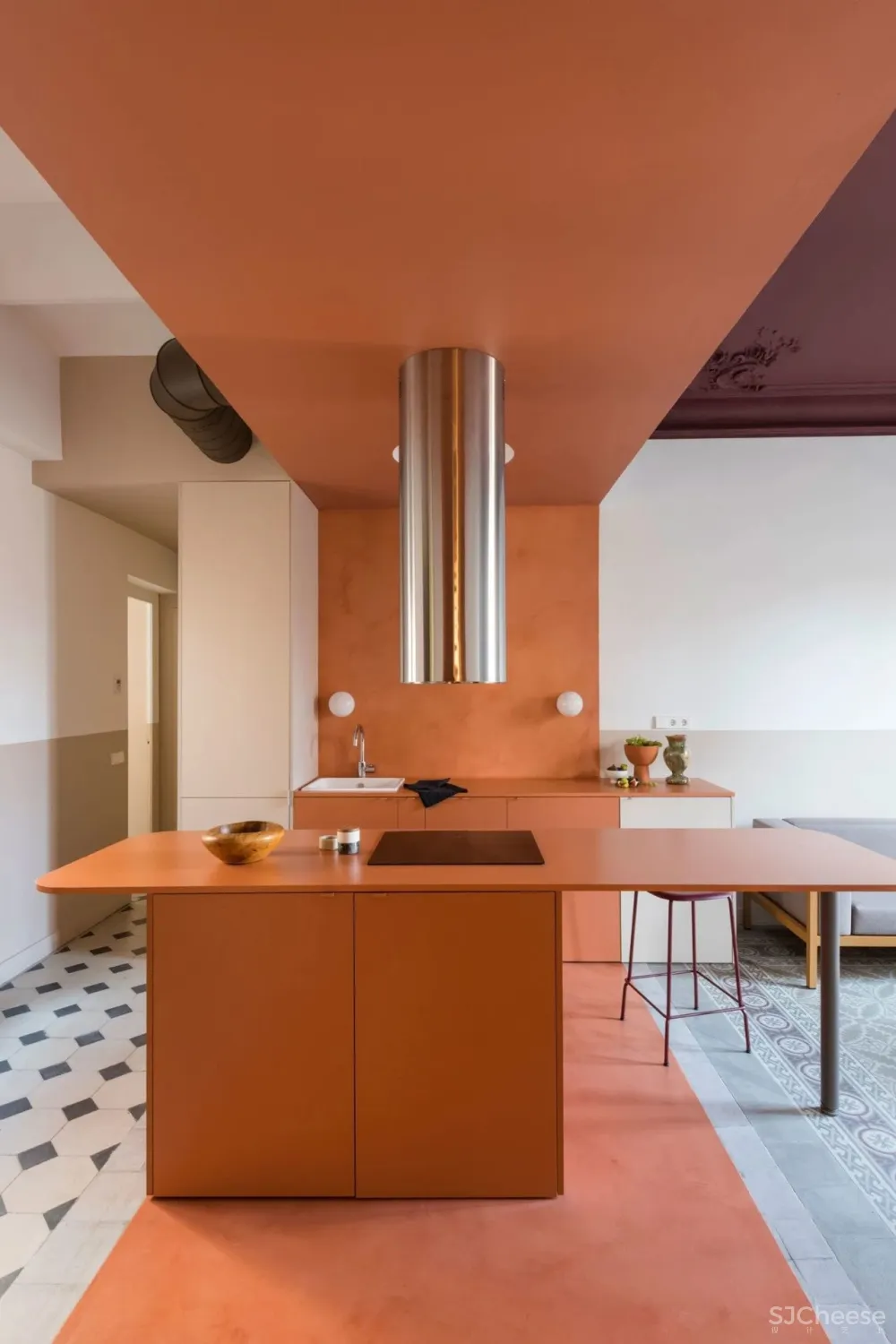 为了给空间带来秩序,建筑师决定将中心区域作为一个色块来固定公寓,将其涂成充满活力的赤土色。