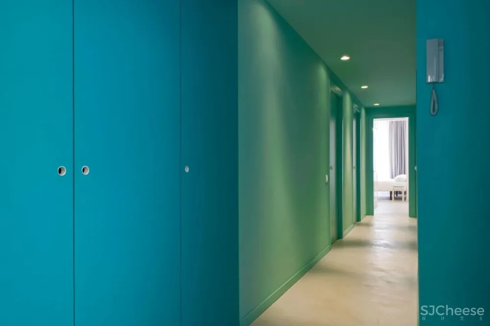 双层玻璃门将睡眠区与休息区隔开,单一色调的软灰色和温暖的赤陶土红色被用来创造流动性。