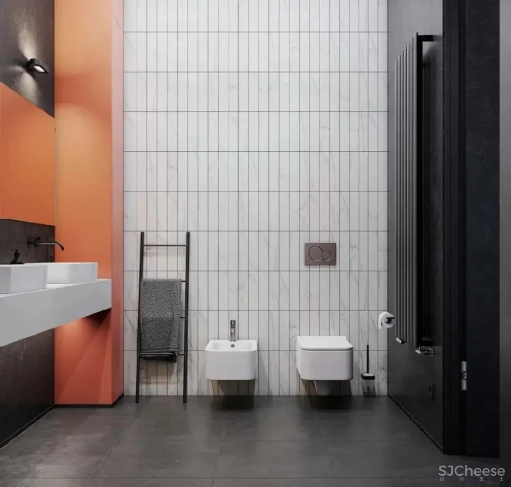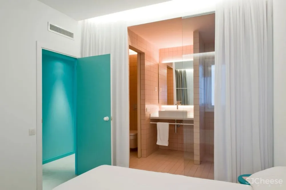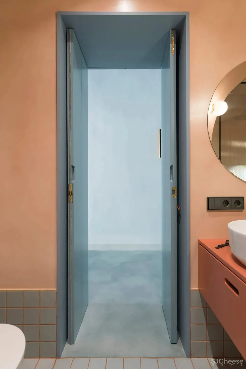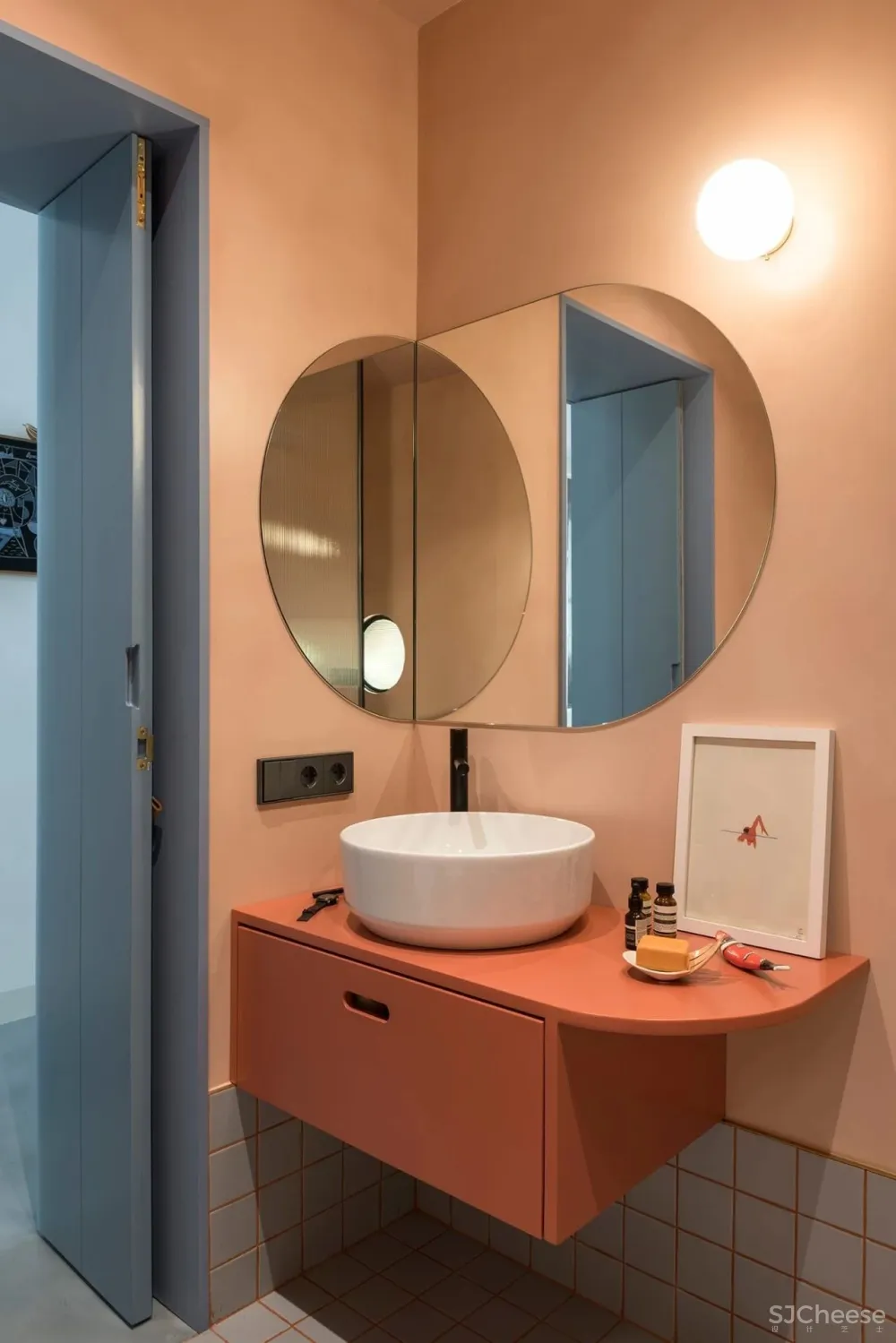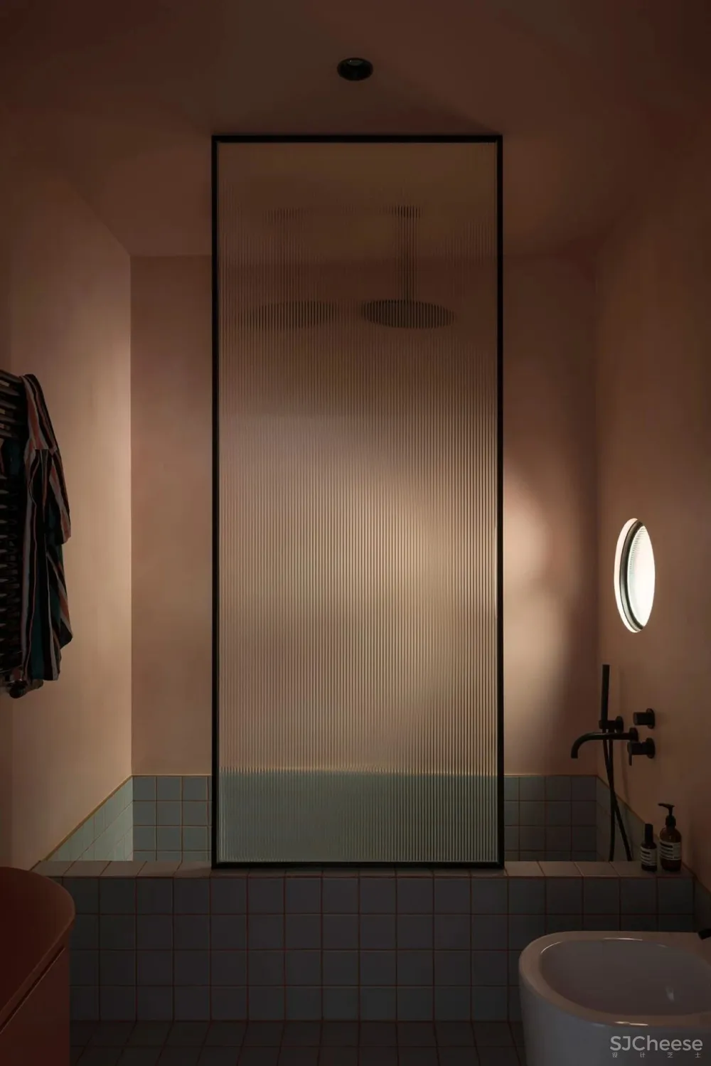 三个房间中有两个浴室向空间开放,展示了一些彩色瓷砖,有粉红色、黄色或浅绿色,每一个都有对比色。