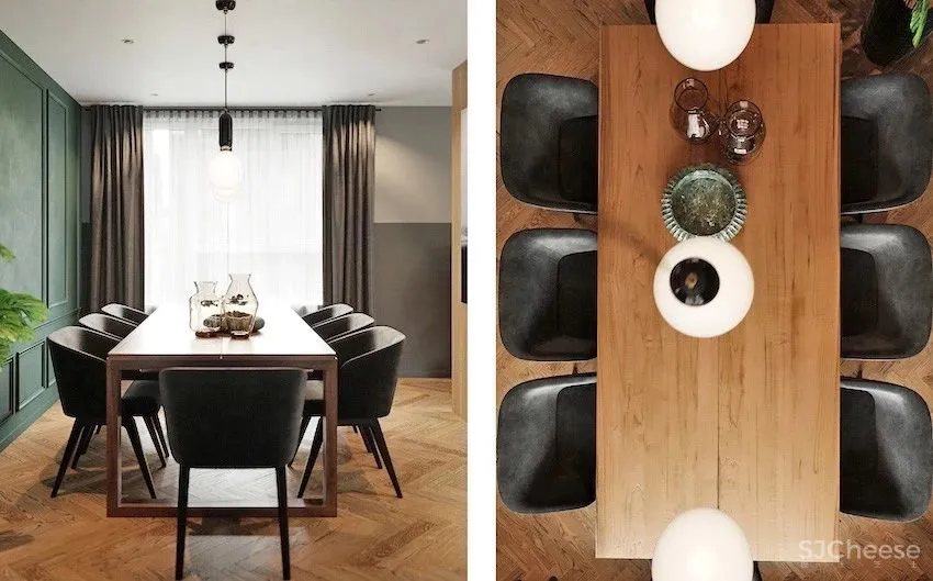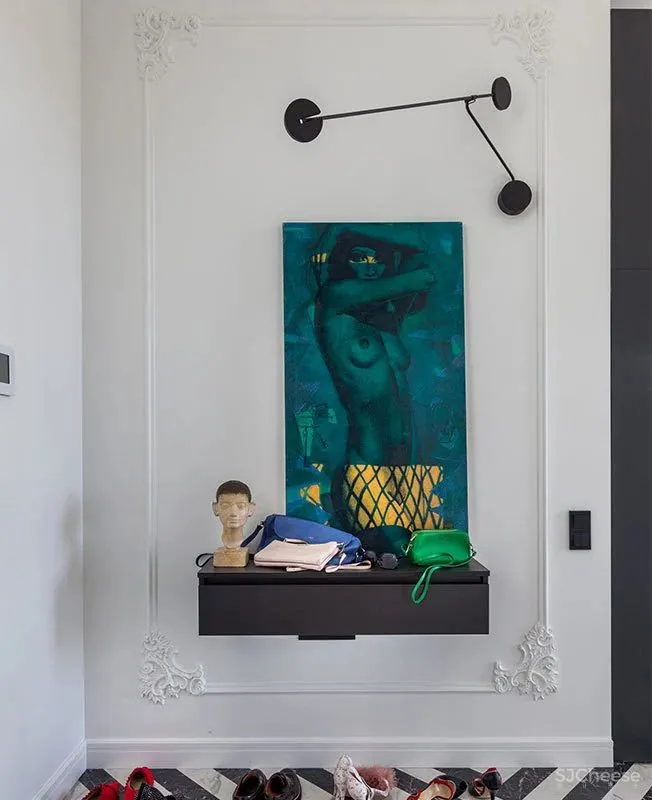 大胆运用鲜活的墨绿色调挥洒在公共空间,人字拼木地板、黑白线格地毯、黑白人像挂画等装饰,加深古典与文艺的气息。