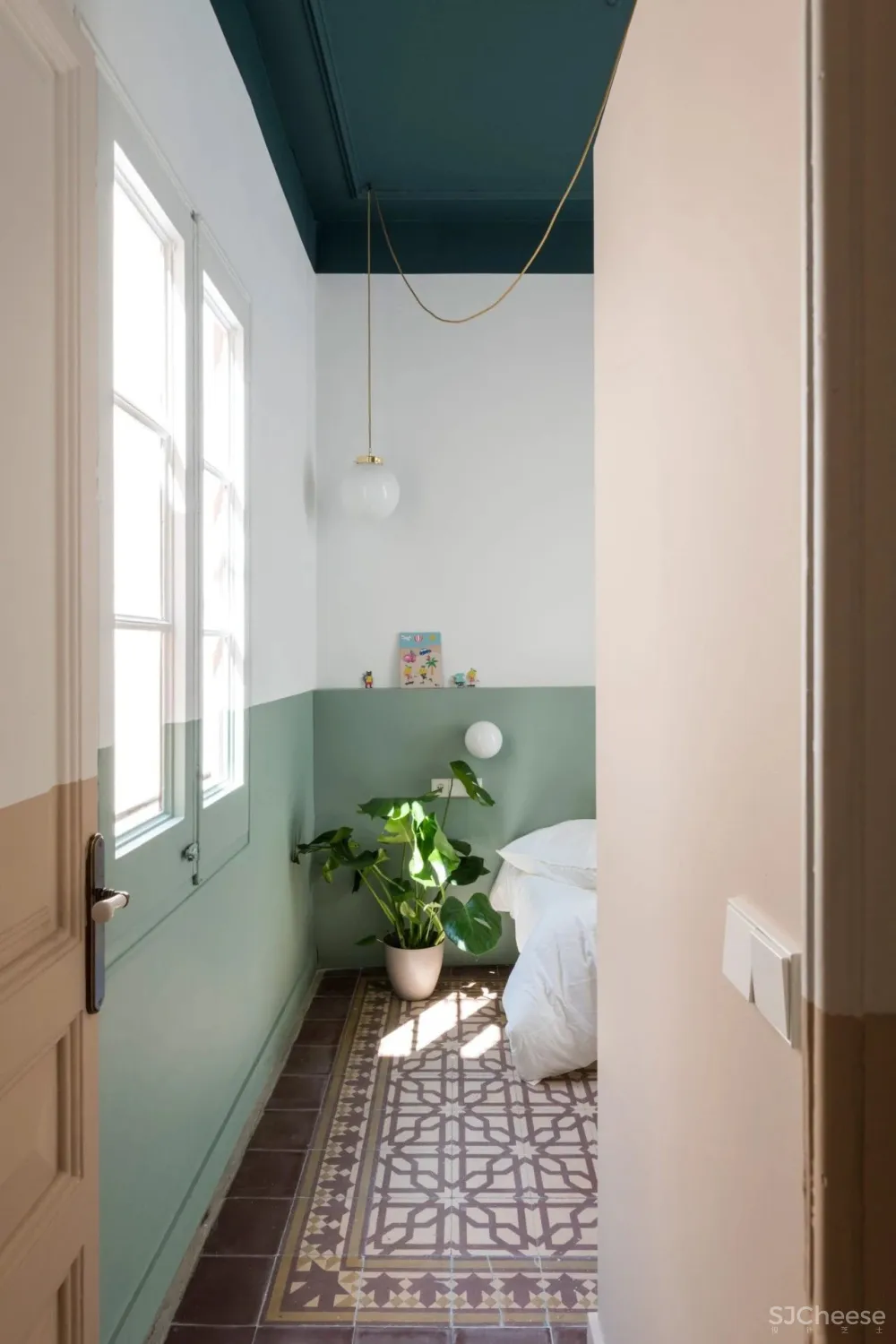 天花板也涂上了大胆的色调,客厅的天花板是紫红色的,卧室的天花板则是深青色的。