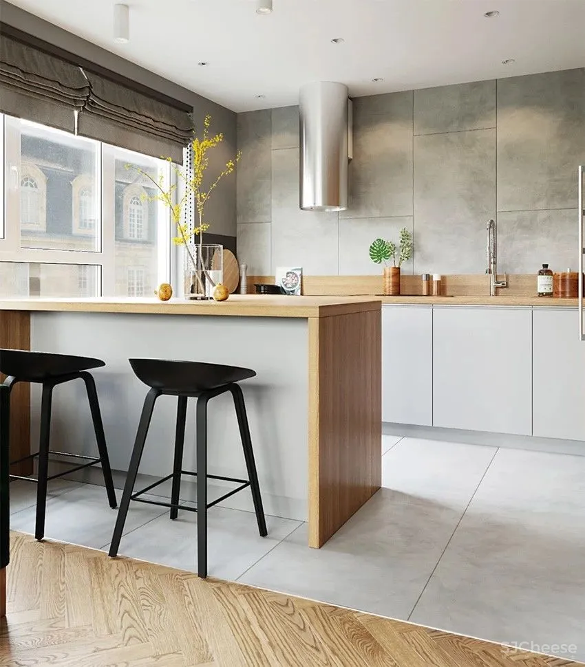 同一色调的微型水泥地板覆盖了三种不匹配的瓷砖风格,统一了整个区域,突出了相邻的楼层。