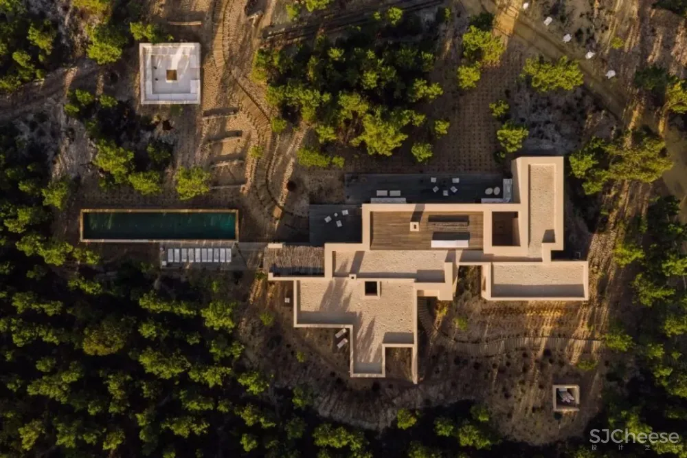 梅利德斯是一个面积为 540㎡ 的平房建筑,建筑看着相当简约,由几个体块所构成,还带有大小两个庭院以及一个泳池 。