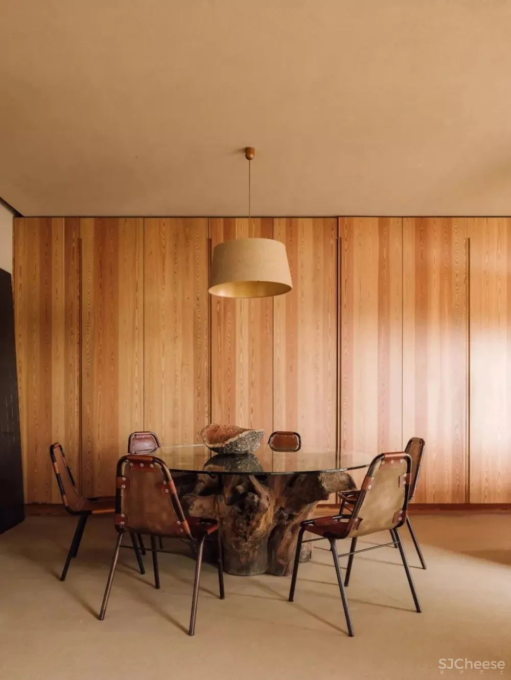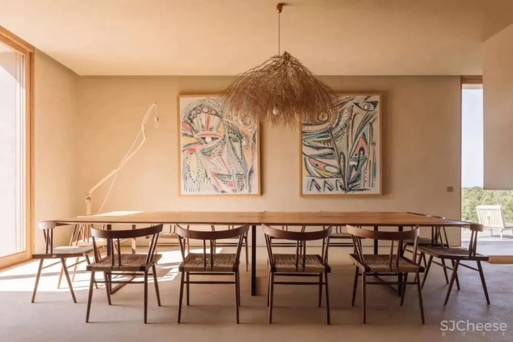 餐厅也是非常淳朴的风格,细长的木头桌椅别具美感,让空间更加轻盈。树枝灯具与周围的环境非常契合,墙面上还有两幅低明度色彩的艺术绘画作品。