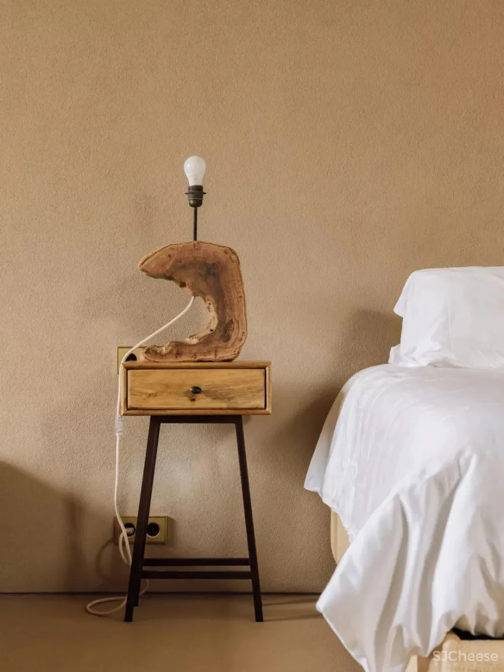 床头柜和灯具具有简单的线条美感,都采用了原始的材料。