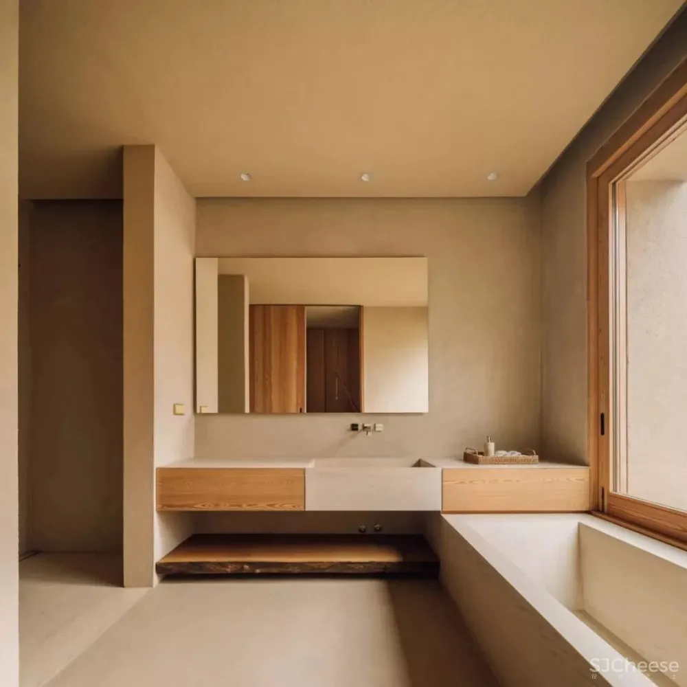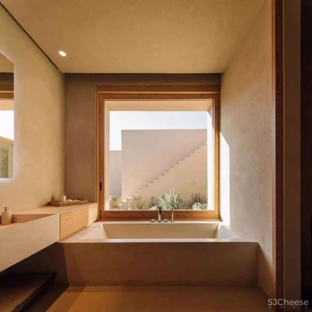 卫生间内带有一个大理石浴缸,上方有一个面积很大的玻璃窗,可以将自然光线和室外的景色带入室内 。