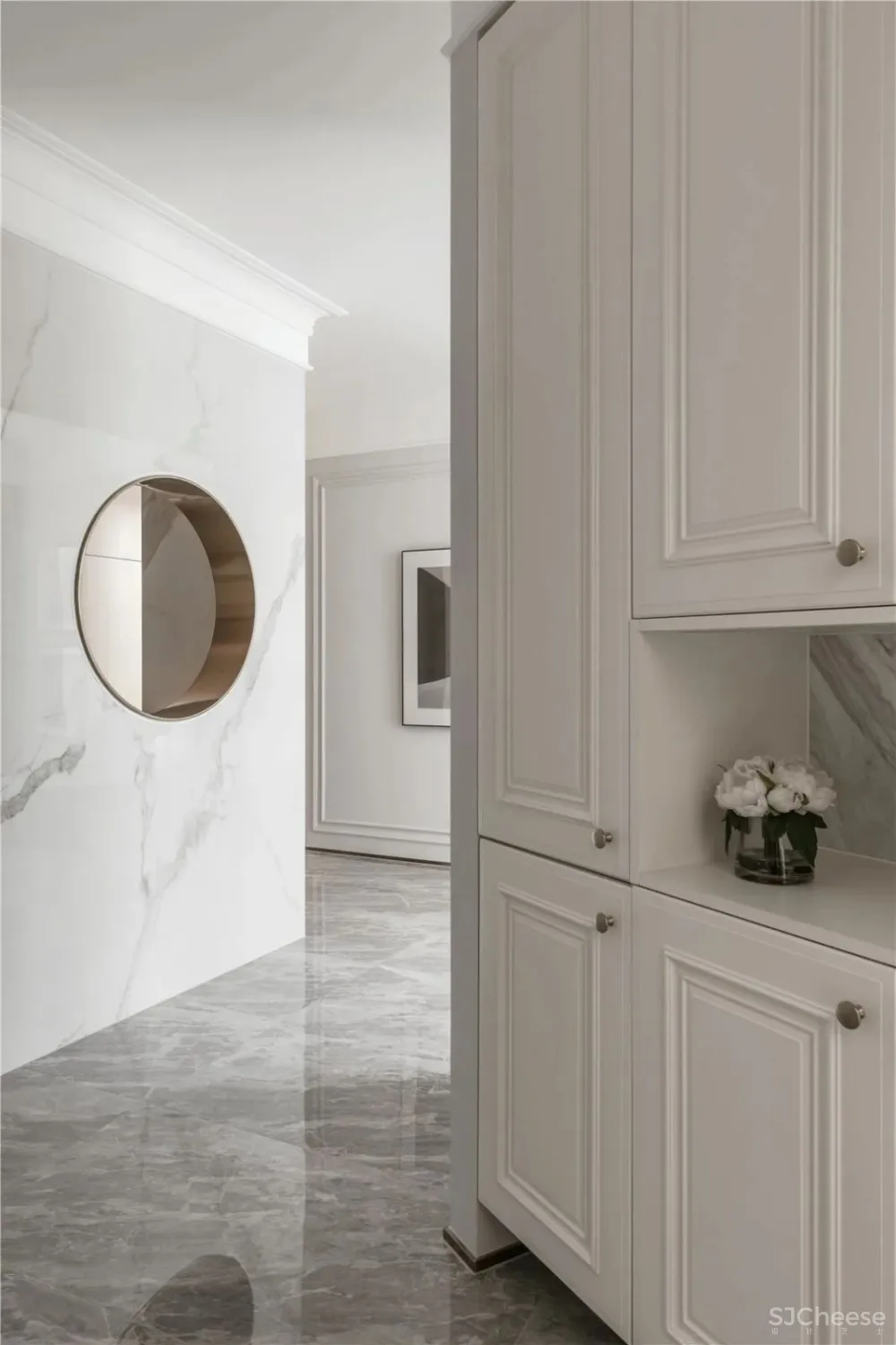 入户右侧玄关处定制一体柜体来满足收纳与台面功能,圆形钛金镂空透景设计增加空间趣味性。