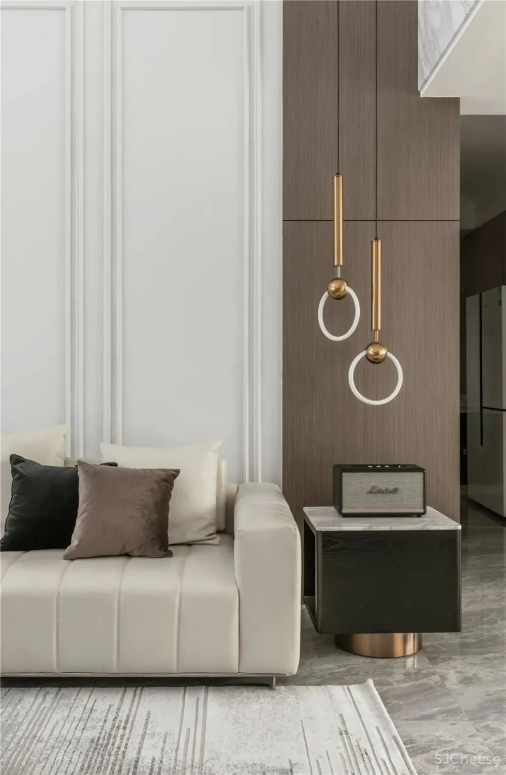 空间整体色调和统一,天然大理石餐桌搭配皮质餐椅,传递就餐区的细腻格调。