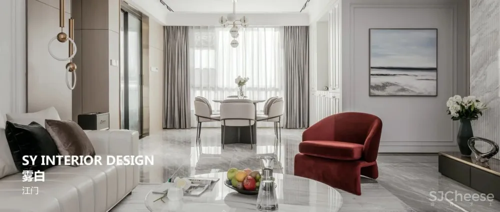 经典黑白灰系配色,用一抹红点燃空间。复式挑空层高,大面积的落地窗户把室外四季景色引入客厅,自然的动态变换成为空间艺术装饰的一部分。
