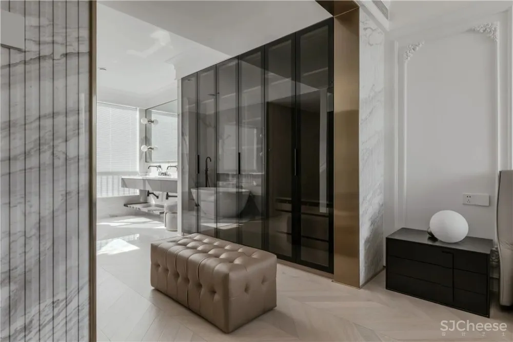 步入式衣帽间与洗漱干区衔接,贯穿整个空间。视觉延伸通透,镜面反射间不断循环。