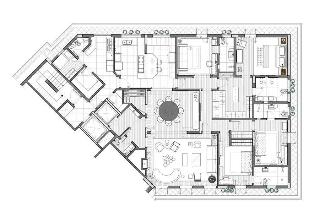 宽敞的客厅被两个较小的房间占据,避免了两个沙发和一个大咖啡桌的僵化配方。