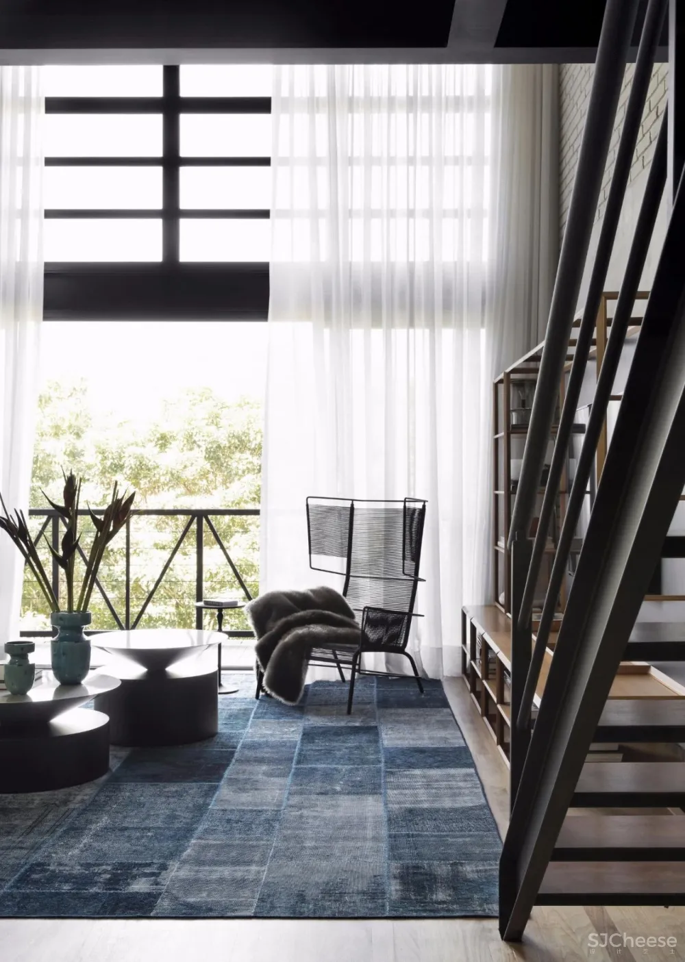 客厅靛蓝色的地毯,深浅不一的蓝色色块营造出丰富的层次感,