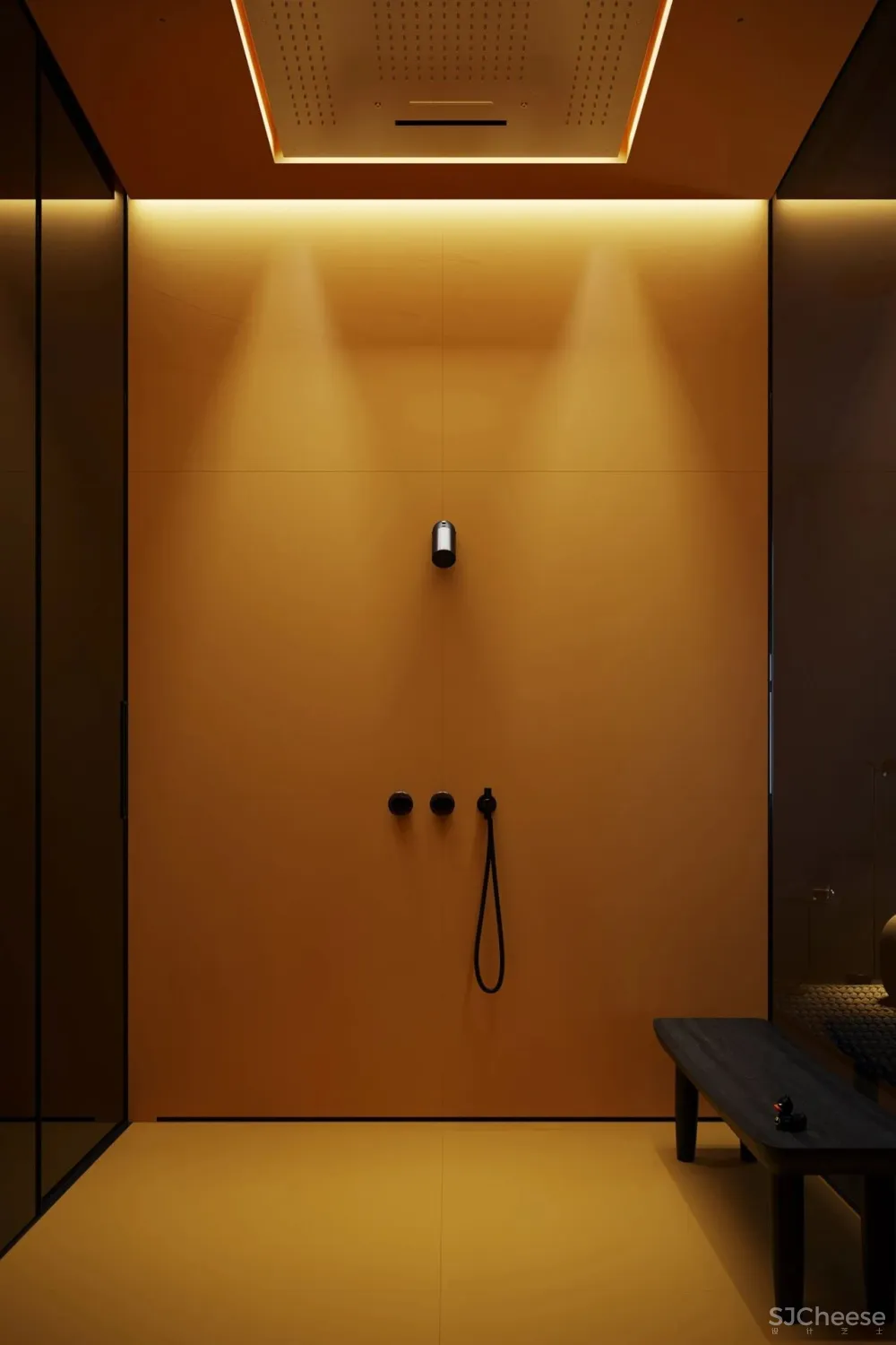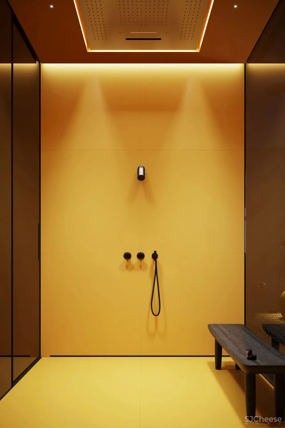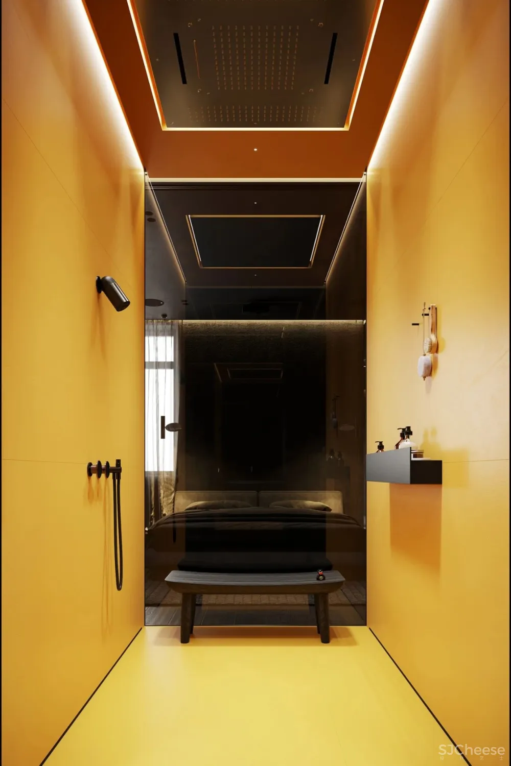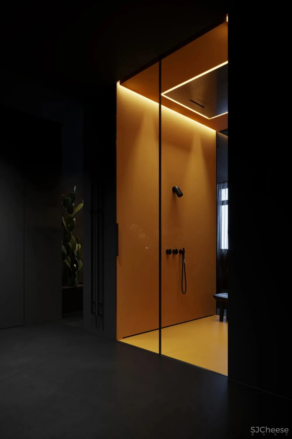 卧室里的黄色沐浴间,透明的玻璃门,瞬间点亮了整个卧室