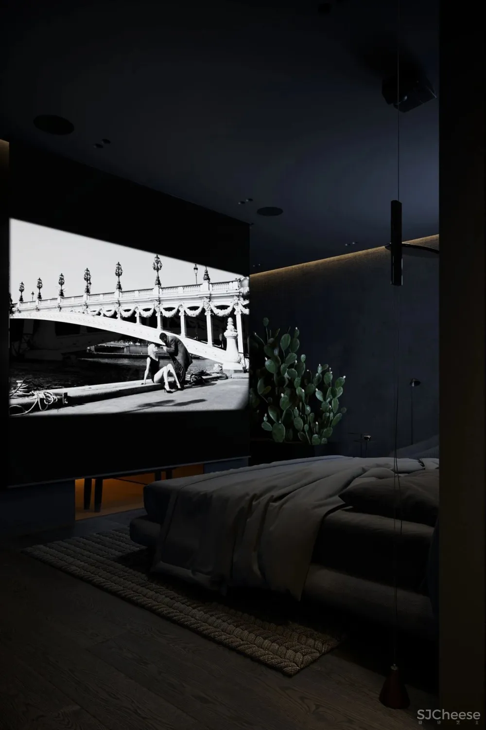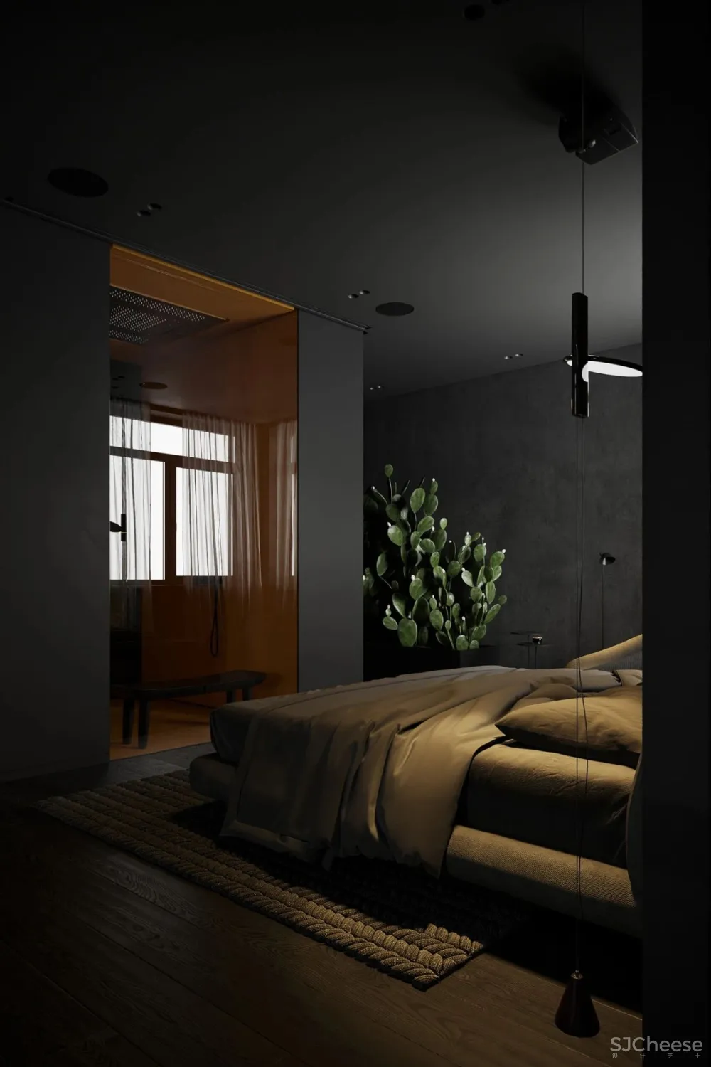 这是一个经典的黑色卧室,其中展示了业主最喜欢的纹理,