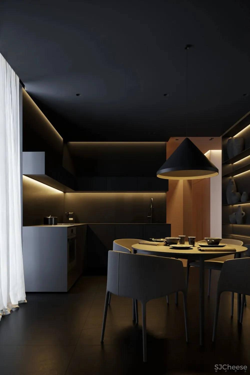 黑色的厨房,这个空间却不显沉闷,是因为有了灯光的加入,高贵感骤增。