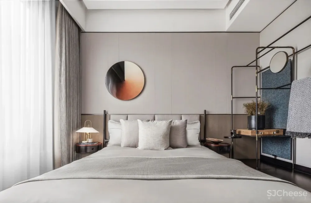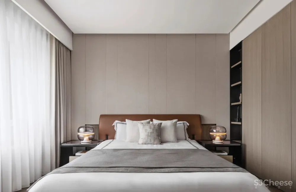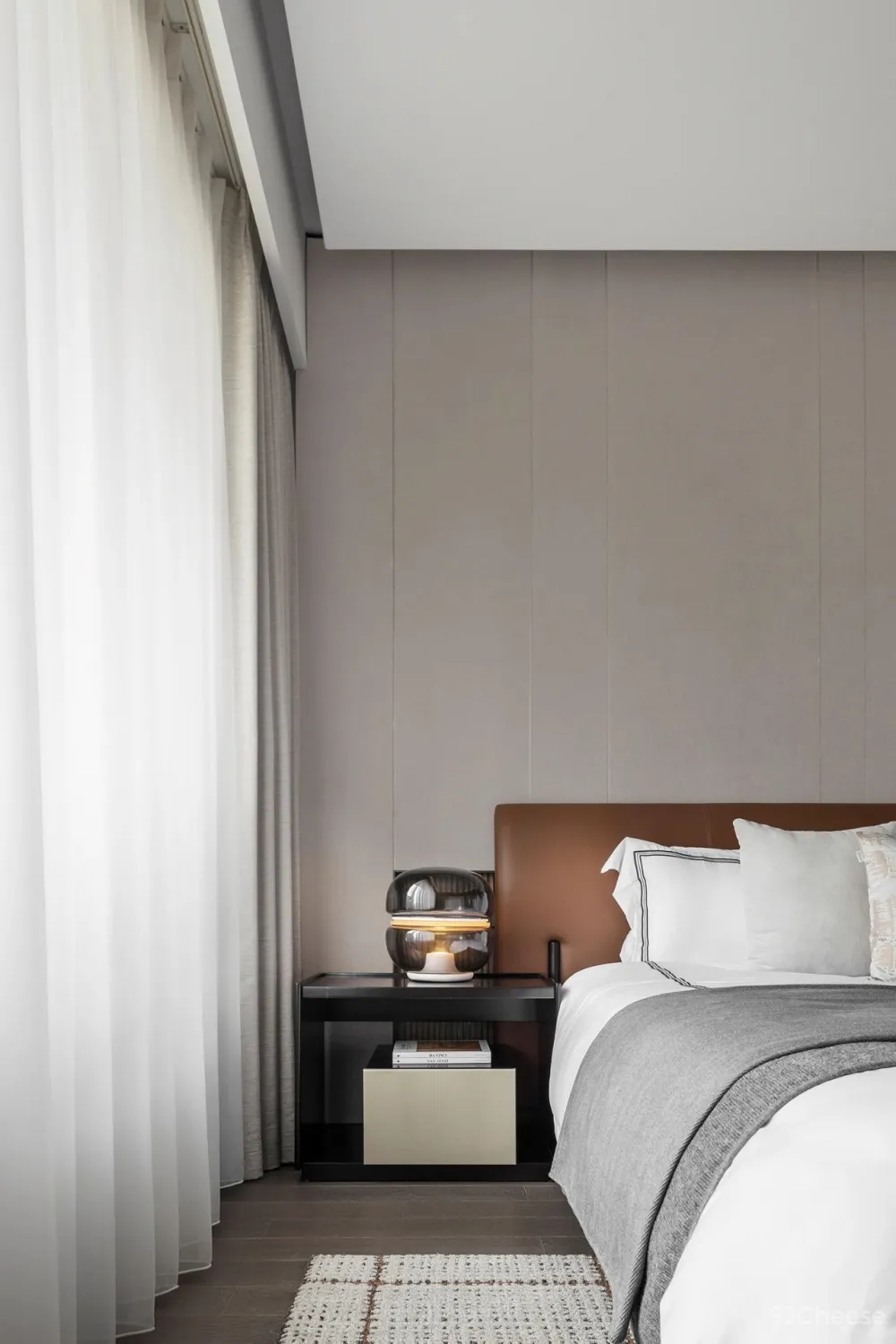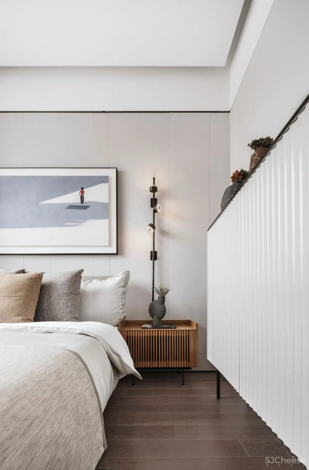 低饱和色度空间氛围和意识形态绘画作品之间的巧妙兼柔,结合灯光的映射,为主卧增添了几分雅致柔情。把握「藏」与「露」之间的方寸尺度,特意留空的收纳空间更彰显主人的艺术品位。