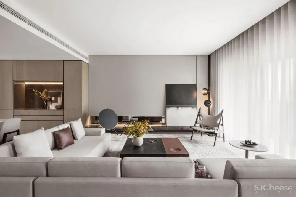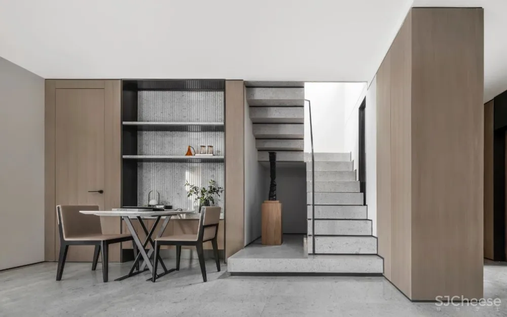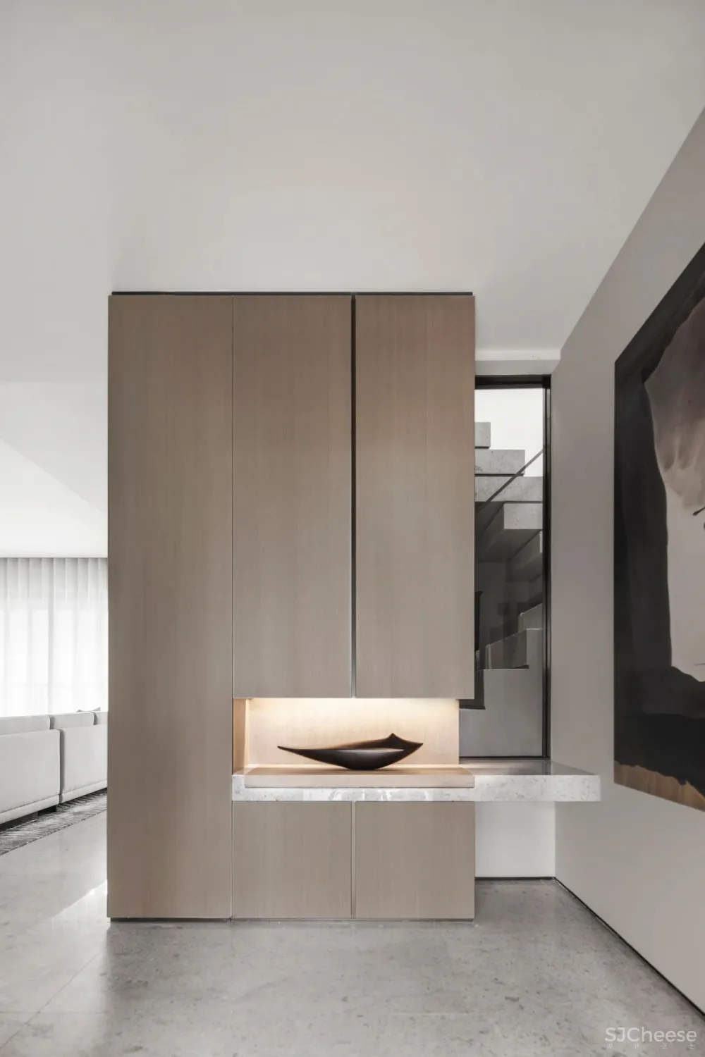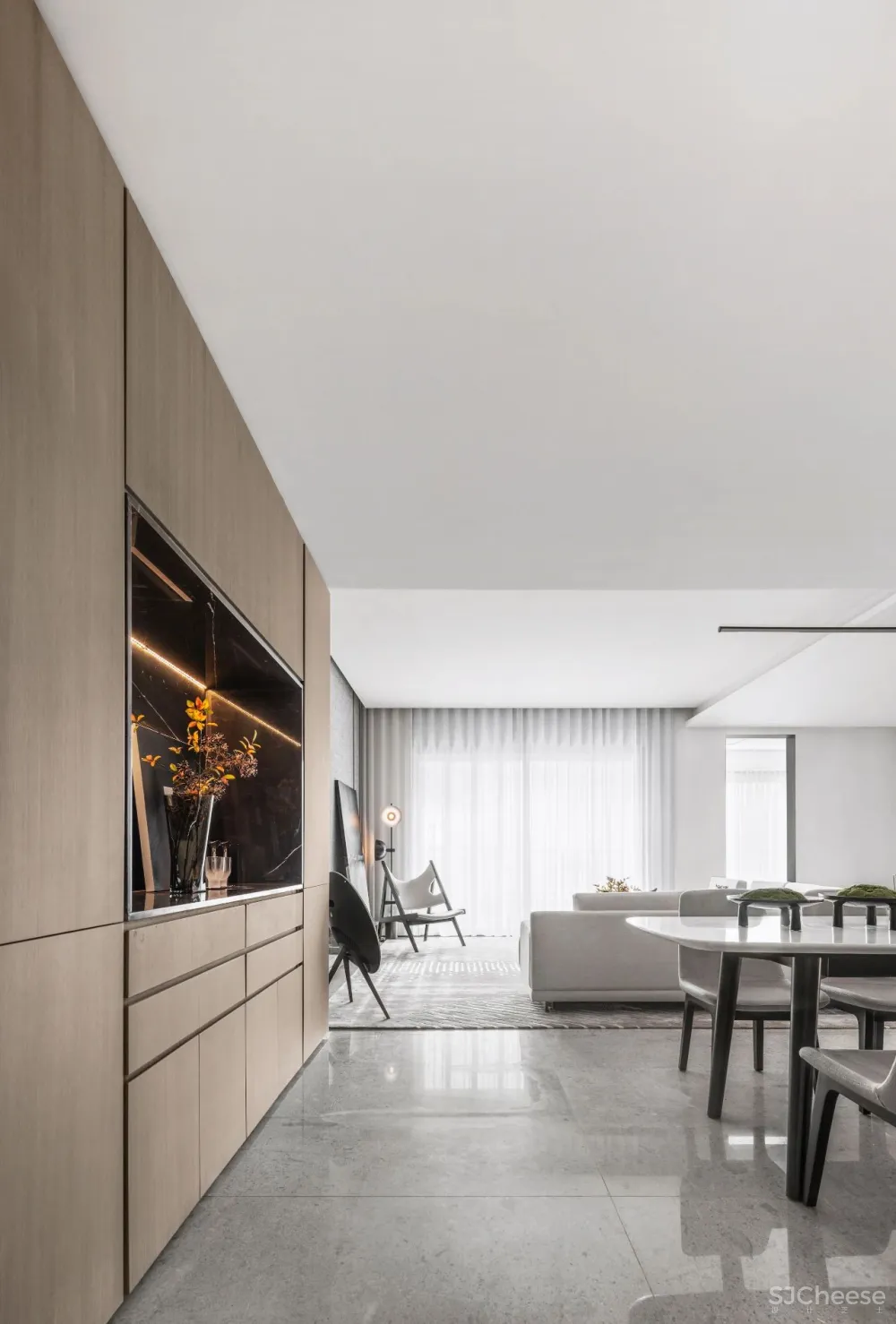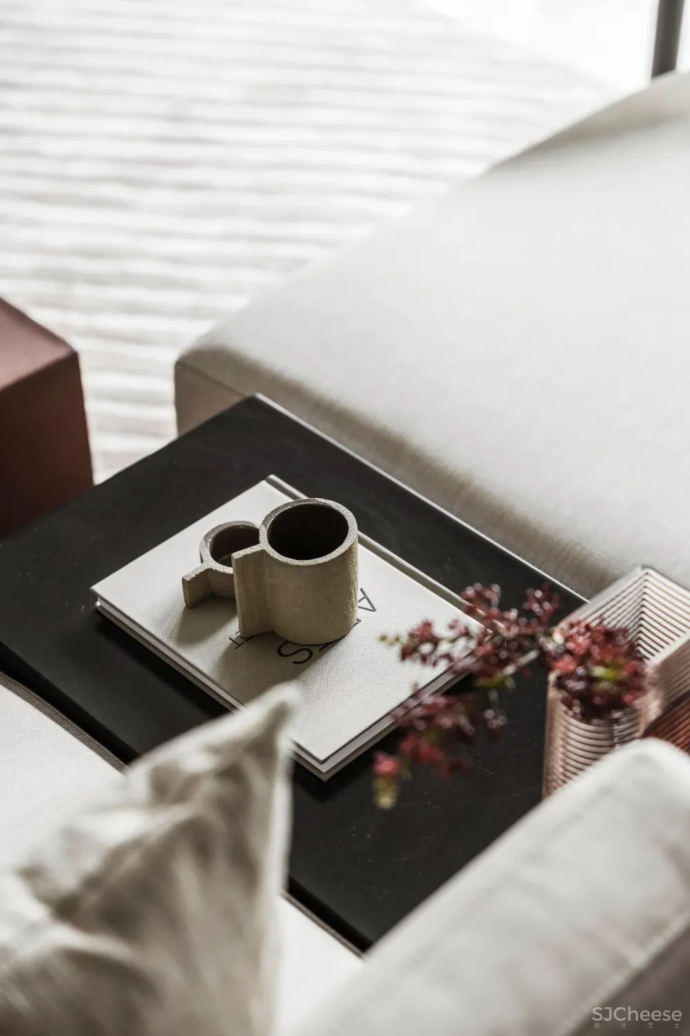 简洁有序的空间布局,暗隐内涵沉稳之气度,让人产生「乍见之欢,久处不厌」的眷恋之情。简洁到不掺杂一丝冗余的块面,意味着居住者内心的充盈和从容。