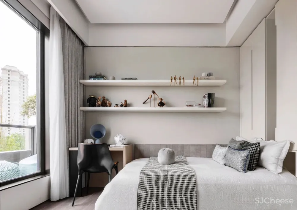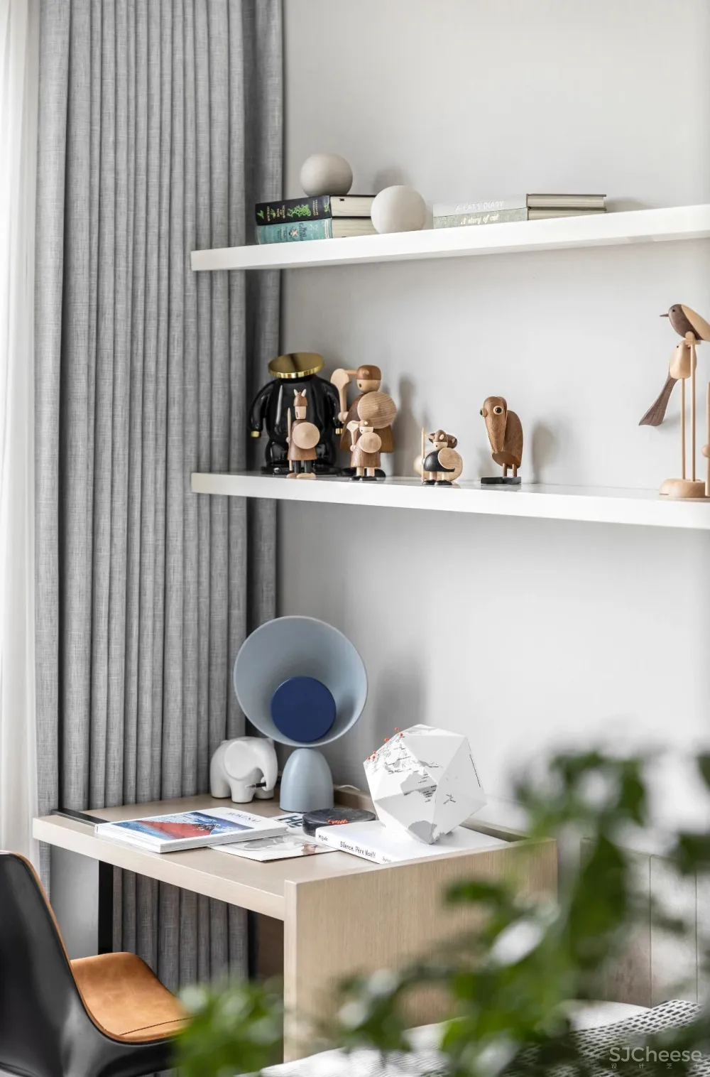 抛却陈规,独一无二的露台景致留给了儿童房,充分体现了对儿童成长的体贴关怀。与户外的繁华喧闹相比,儿童房则延续简洁的风格,去主题色的设计是一种留白。纯粹童真的色彩,应该留给孩子自己来涂鸦。