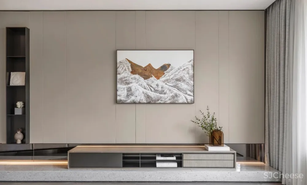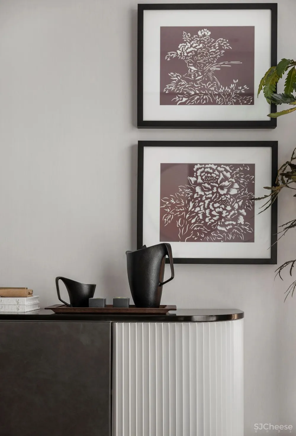 玄关是“家”的第一印象。一个有温度的“家”,便从玄关开始。一副艺术挂画与顶天立地的玄关柜彼此相和,虚实相生。玄关柜镂空的位置摆放着艺术摆件,既打破了立面的刻板单调又兼顾了展示功能。入门仪式感,包含了对主人的尊重与关怀。