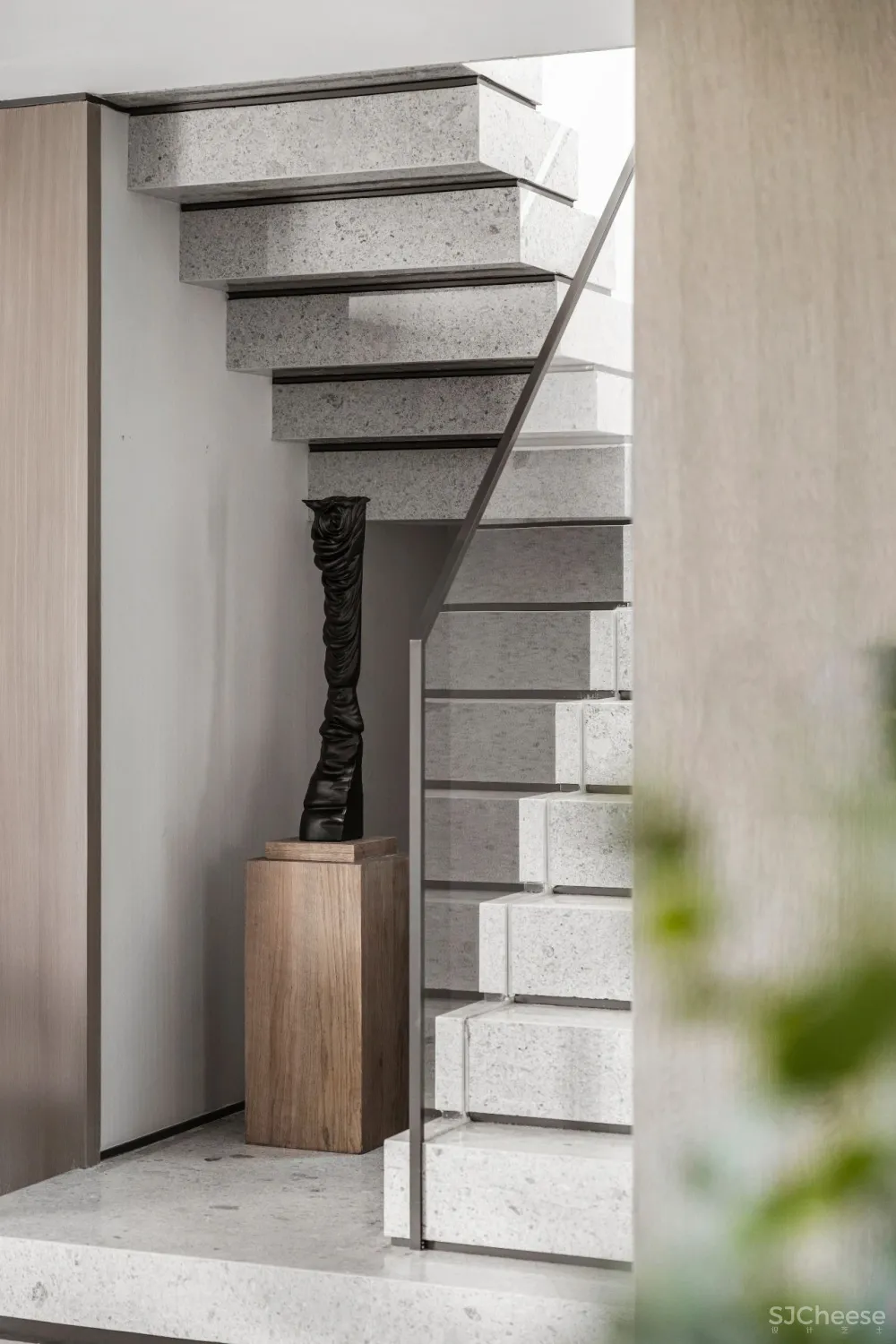以建筑手法造景,楼梯间既有石材的厚重,也有玻璃的轻盈,再添一尊伫立的雕塑,小小角落也横生趣致。