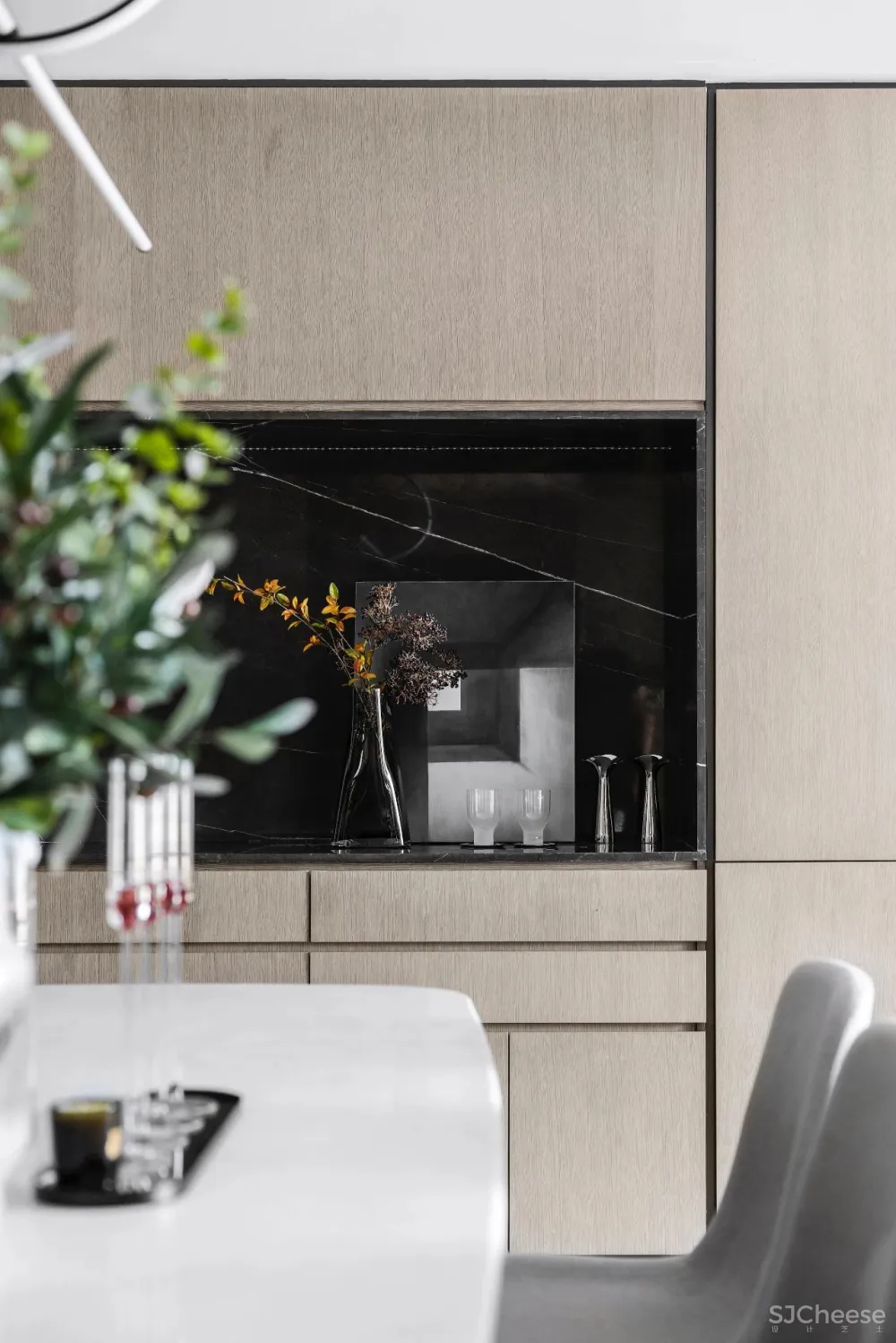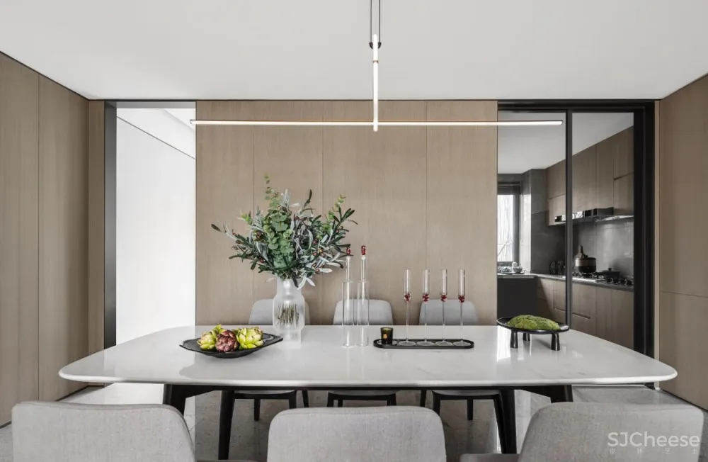 高级感十足的浅灰桌椅与细巧的金属吊灯组合,尺寸慷慨的餐边柜使得整个餐厅视觉效果更加立体轻盈。