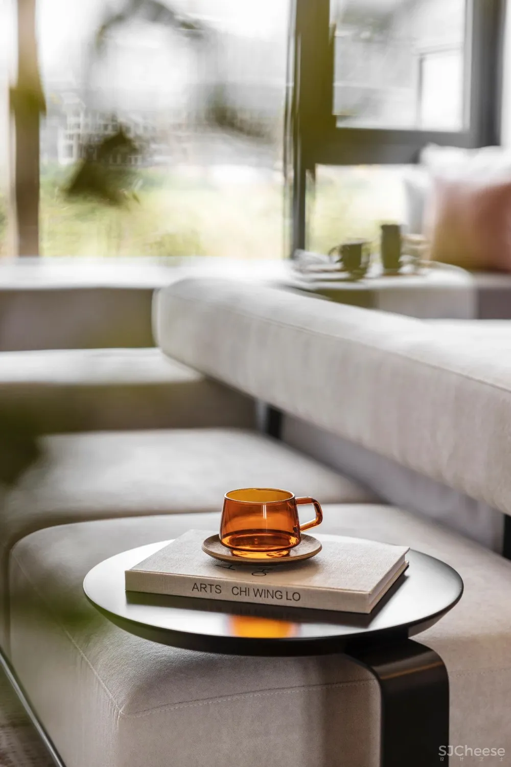 客厅面朝的全景落地玻璃,揽景入怀。树影花语,每个被阳光浸润过的角落,一切尽在不言中。