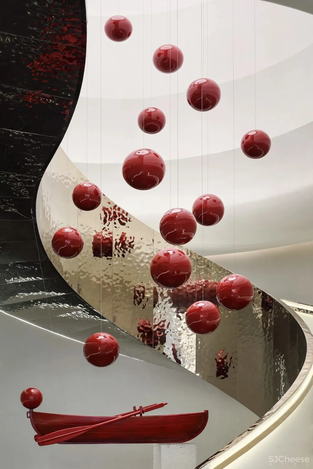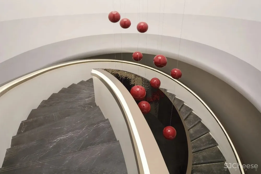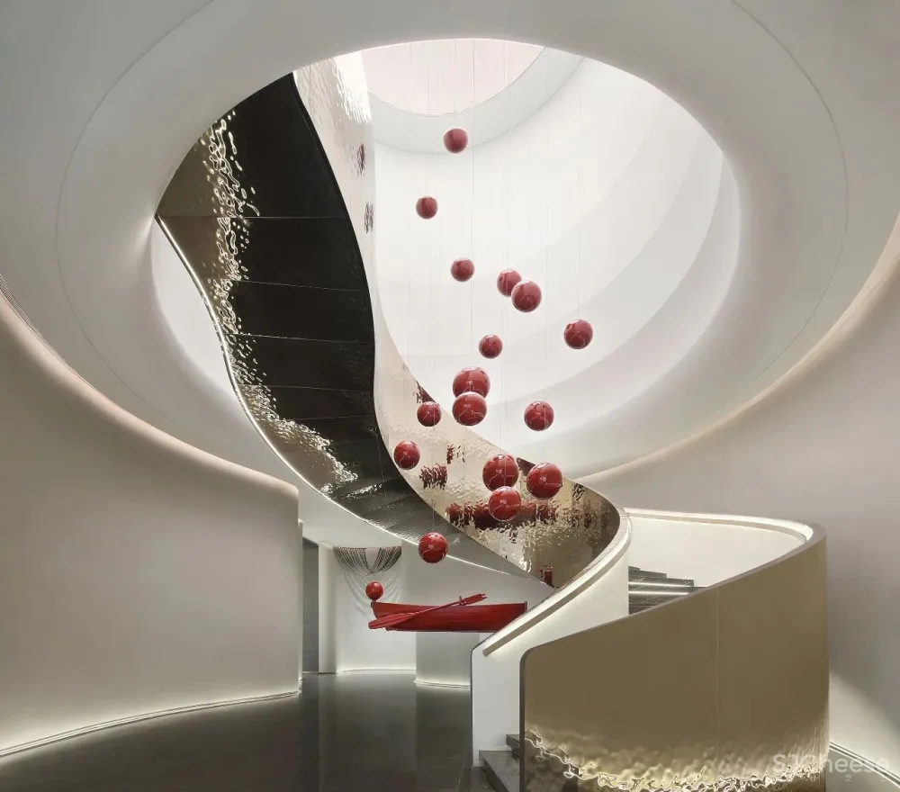 Surging River and Han dynasty, the Chronicle of the South, the staircase is not only the pause point of the space, but also leads the core line of sight, accompanied by the moving line from the bottom to the top. The floating boat art installation flows with the light wave, which is also true and unreal.