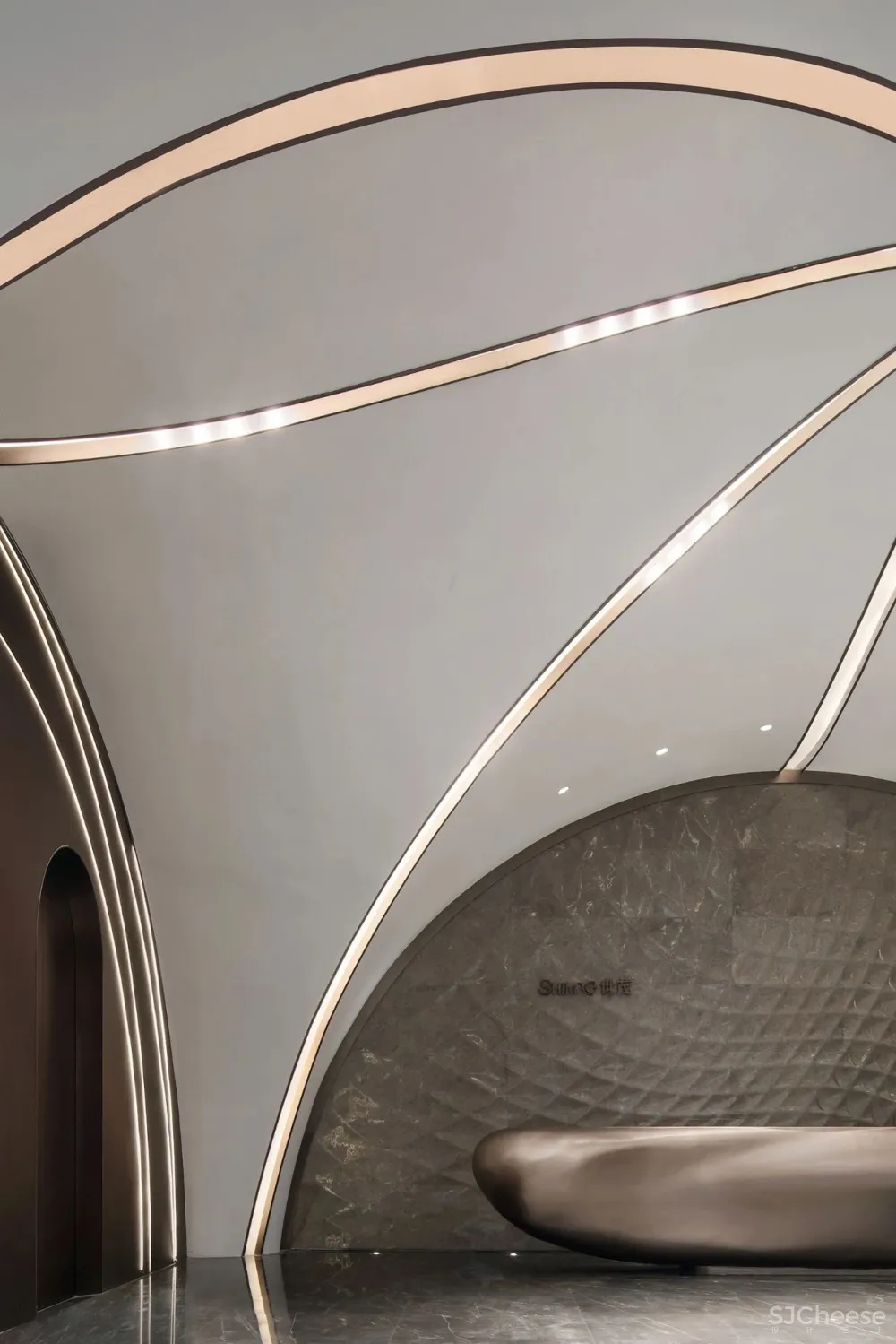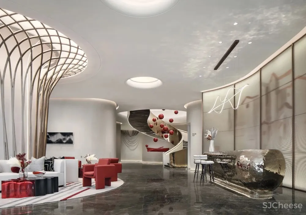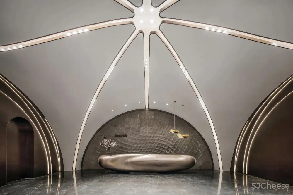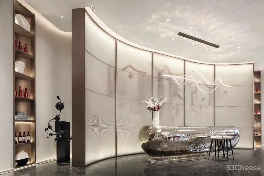 镂空编织肌理石材在灯光下如同水面的波光流转。接待台取意为舟,使人不禁联想起泛舟江边的自在之行。左右两侧的金属饰面灯带造型则通过地面的反射映照出一个完整的编织形态的圆。