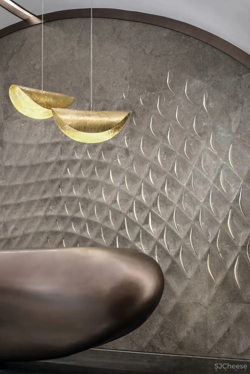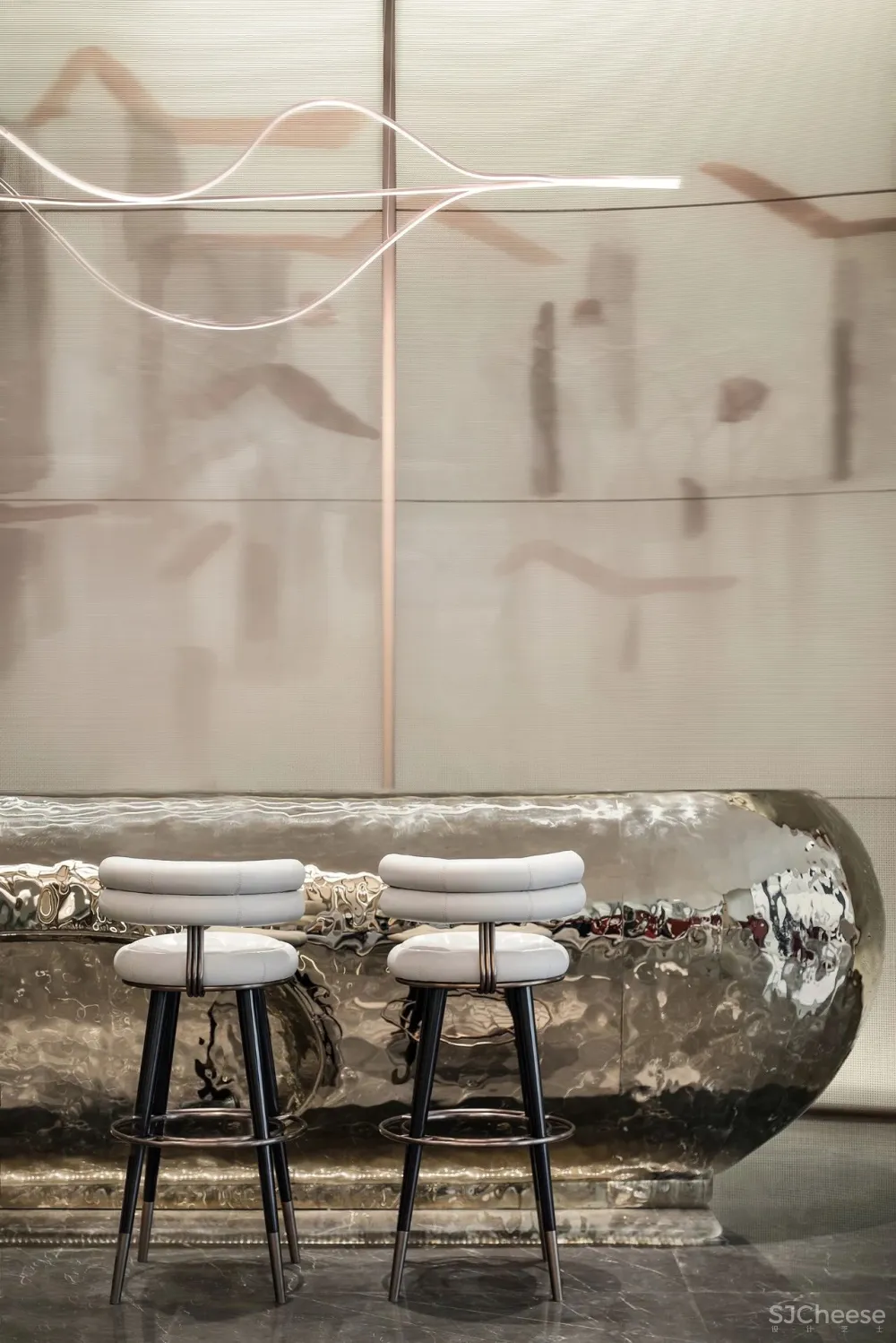 主要材质:艺术石材、肌理漆、定制金属骨架、镀钛不锈钢