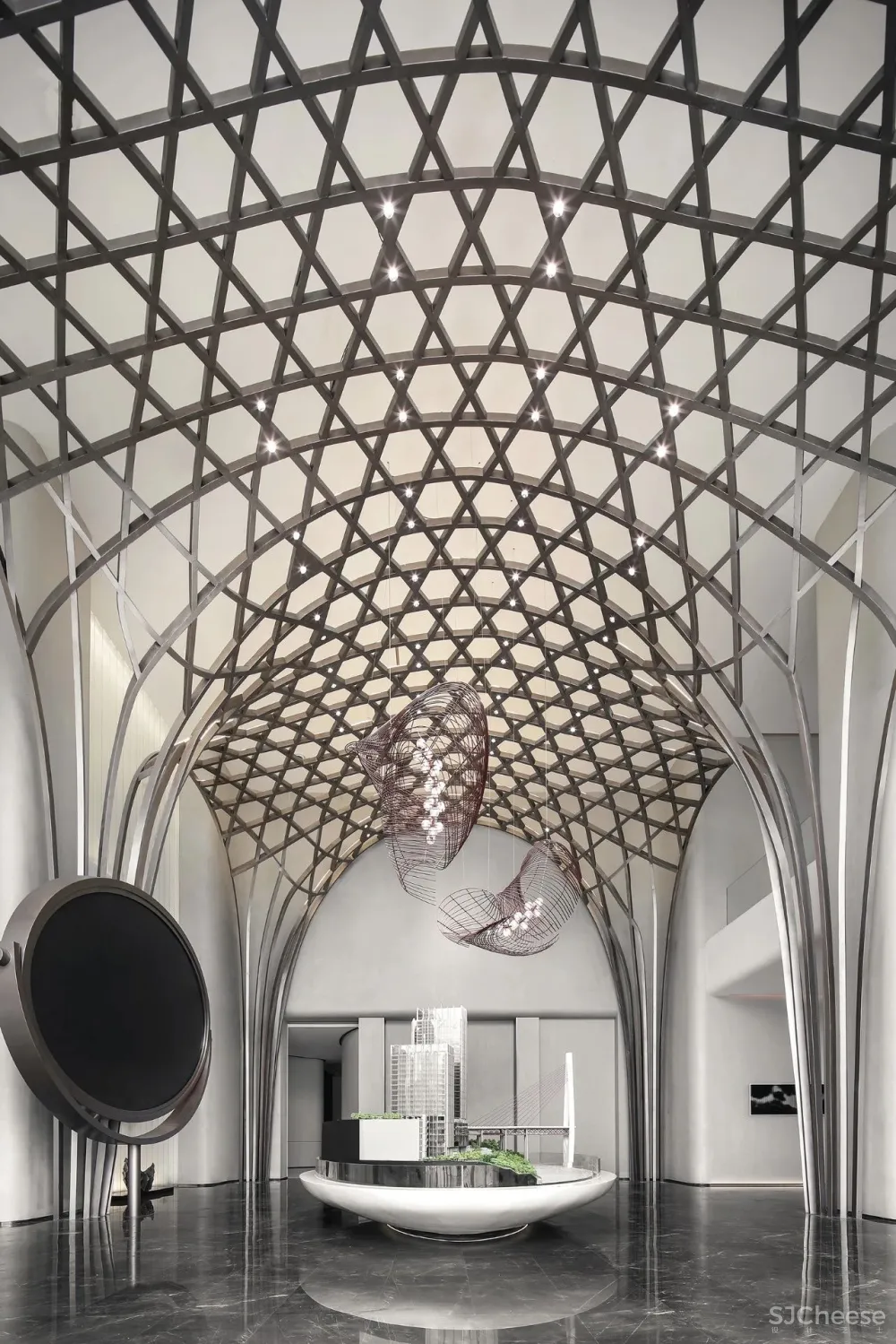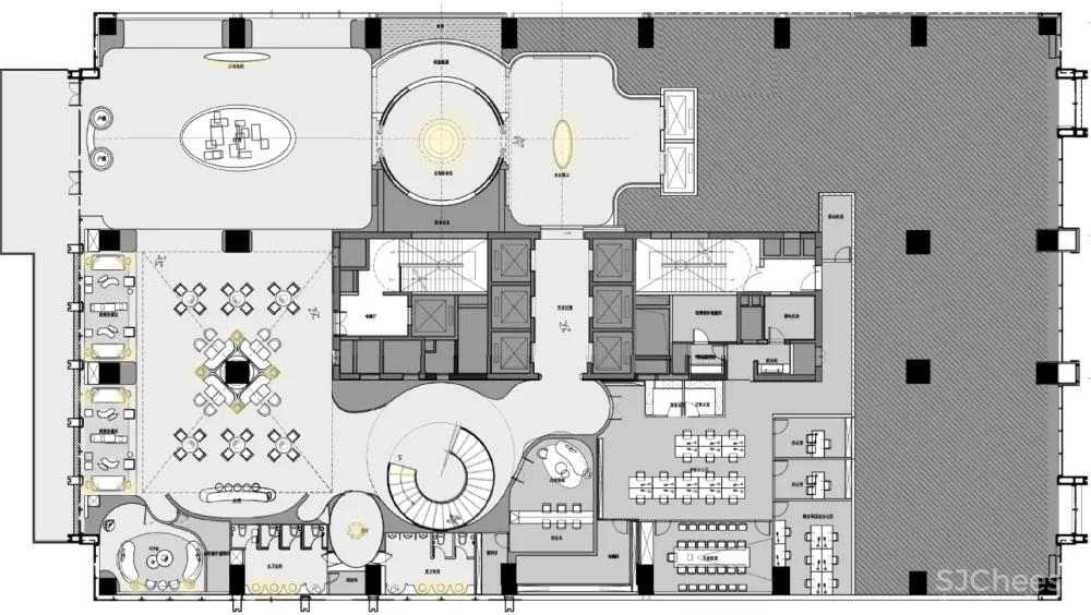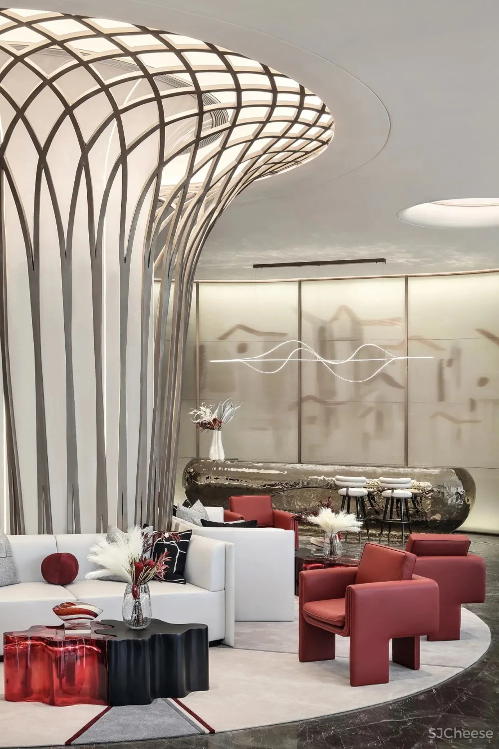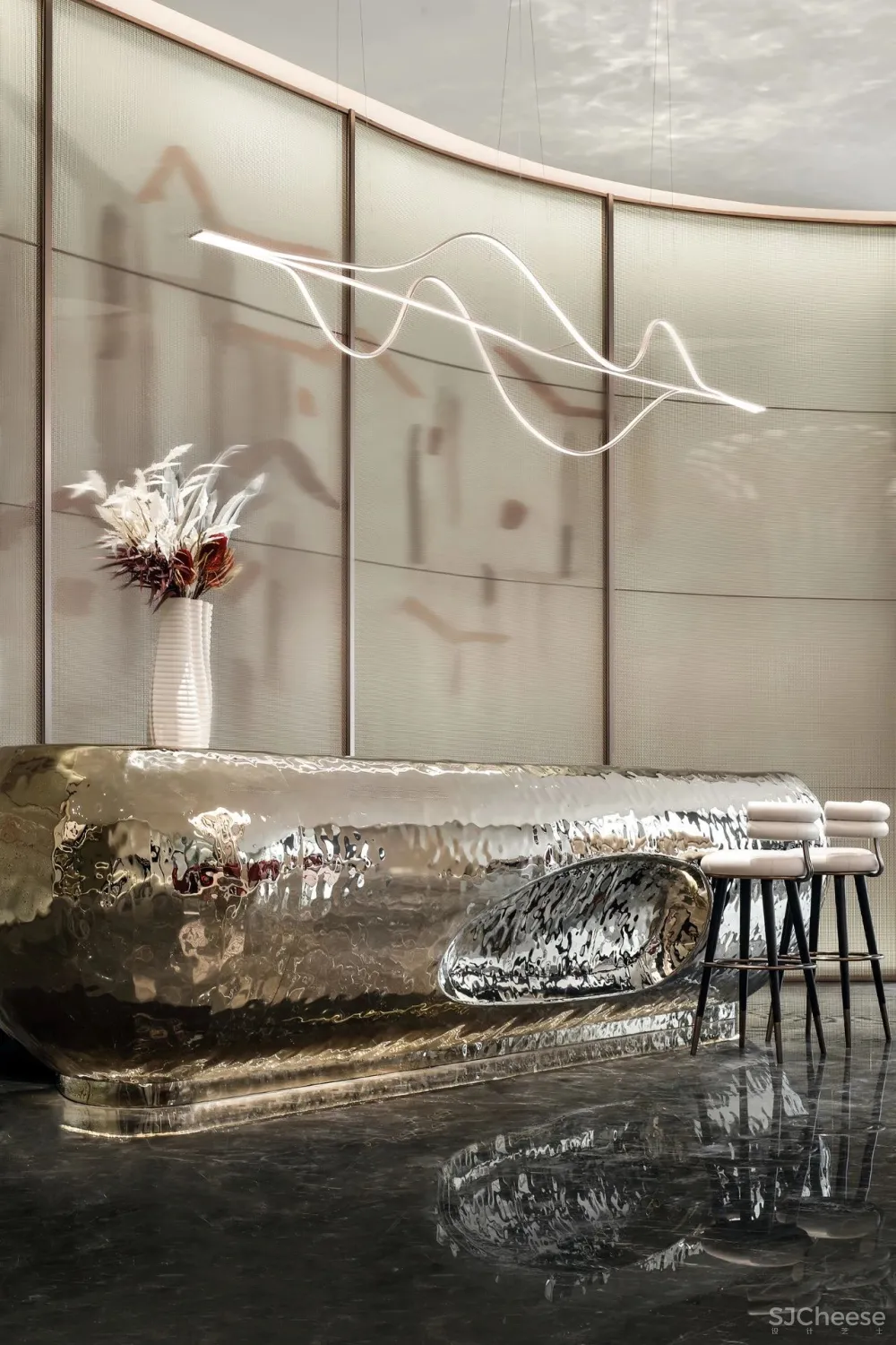 Hollow weave texture stone in the light as the wave of water flow. The reception desk refers to a boat, which reminds people of a boat trip by the river. On the left and right sides of the metal decorative lamp belt modeling through the reflection of the ground reflects a complete woven form of the circle.