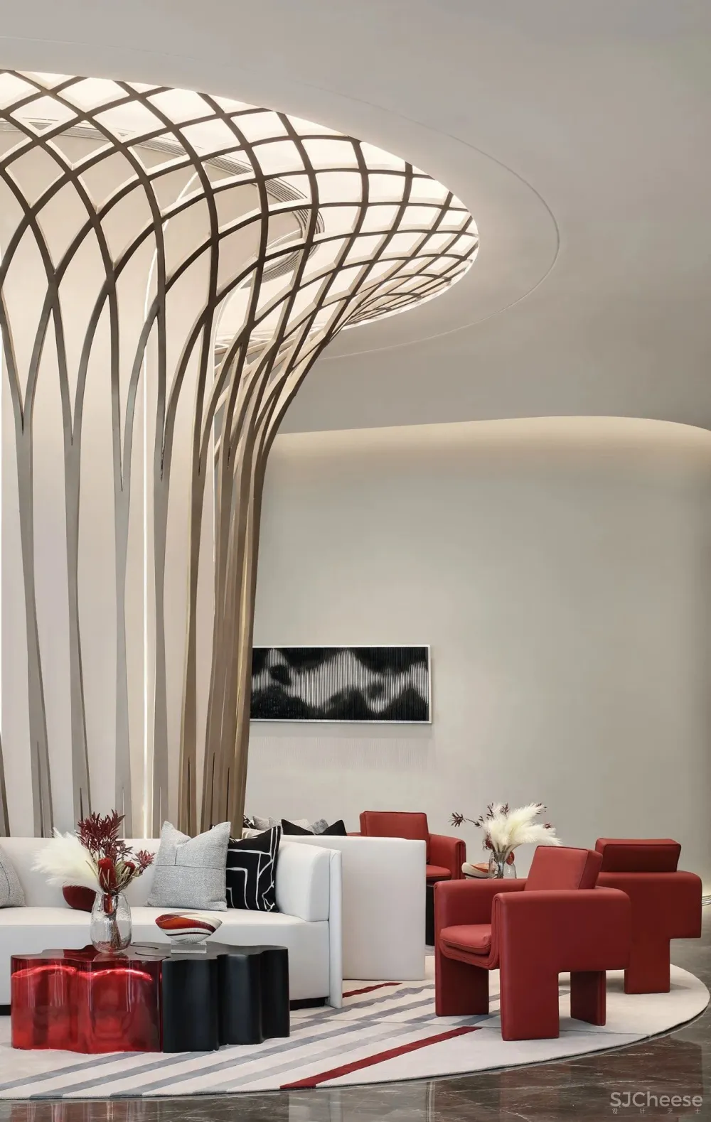 好的空间不仅展现光明,也展现阴影,空间、光影、艺术、体验正是洽谈区设计核心之所在。光透过软膜天花材质,穿过编织金属骨架,营造了丰富的空间层次。