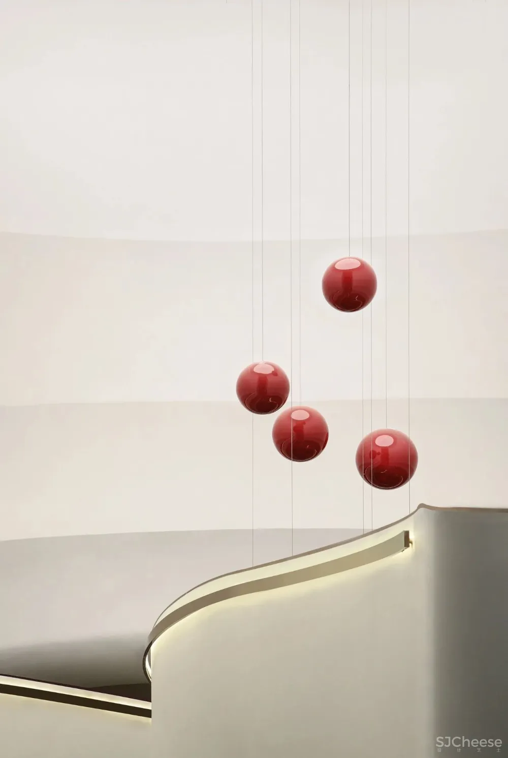 光是空间的物理介质,色彩则代表着空间的感性一面。黑、红、白的经典配色,以及空间的纵深感,构成一副达利式的超现实主义画作。