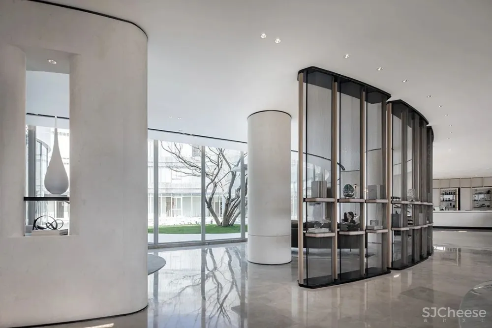 入口到达前厅,左右两边围合的弧形墙面,犹如展开怀抱礼宾,呈现尊贵感及礼仪感。入口正对面的整面玻璃,最大化地将室外庭院景观纳入室内空间,形成了“前厅堂后庭院,先礼序后自然。”的传统仪式感。